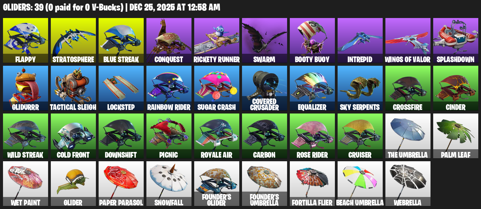 Flappy, Stratosphere, Conquest, Rickety Runner, Swarm, Booty Buoy, Intrepid, Wings of Valor, Splashdown, Glidurrr, Tactical Sleigh, Lockstep, Rainbow Rider, Sugar Crash, Covered Crusader, Equalizer, Sky Serpents, Crossfire, Cinder