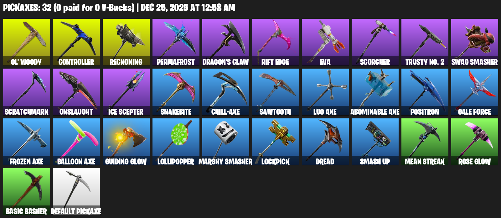Ol’ Woody, Controller, Reckoning, Permafrost, Dragon’s Claw, Rift Edge, EVA, Scorcher, Trusty No. 2, Swag Smasher, Scratchmark, Onslaught, Ice Scepter, Snakebite, Chill-Axe, Sawtooth, Positron, Gale Force