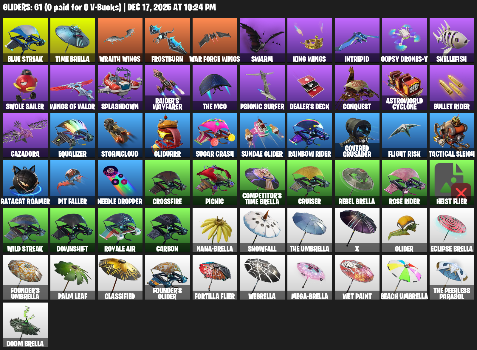 Blue Streak, Time Brella, Wraith Wings, Frostburn, Swarm, Intrepid, Oopsy Drones-y, Skellefish, Swole Sailer, Splashdown, Raider’s Wayfarer, Psionic Surfer, Dealer’s Deck, Conquest, Astroworld Cyclone, Bullet Rider