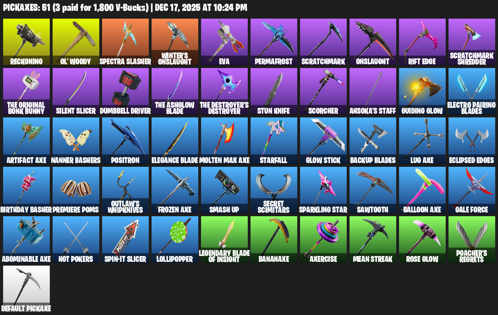 Reckoning, Ol’ Woody, Winter’s Onslaught, EVA, Permafrost, Scratchmark, Rift Edge, Silent Slicer, Dumbbell Driver, Stun Knife, Scorcher, Ahsoka’s Staff, Guiding Glow, Electro Pairing Blades