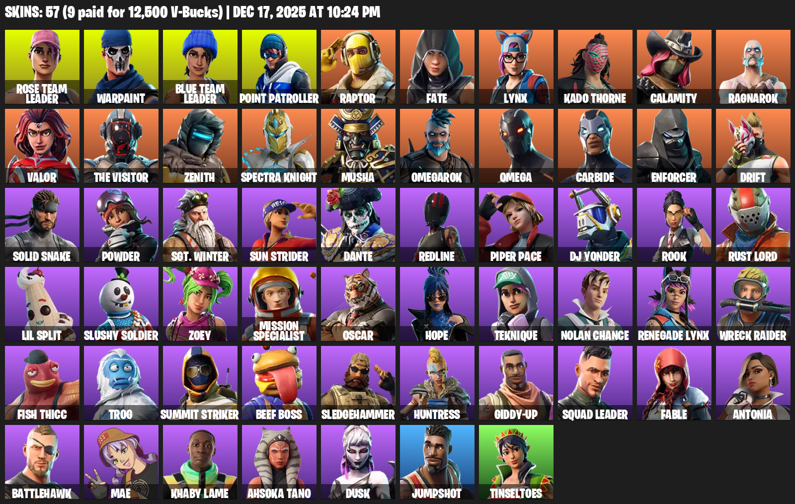 Point Patroller, Omega, Rose Team Leader, Warpaint, Raptor, Fate, Lynx, Kado Thorne, Calamity, Ragnarok, Valor, The Visitor, Zenith, Spectra Knight, Musha, Omegarok, Carbide, Enforcer, Drift