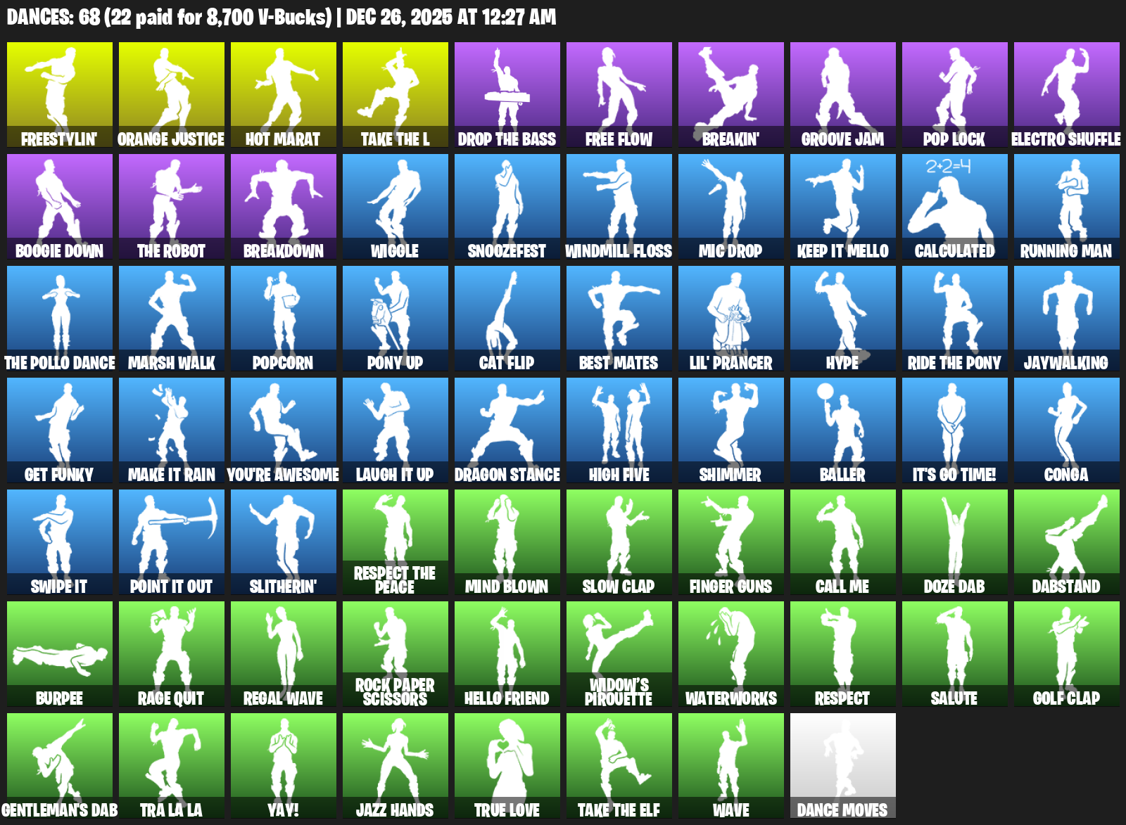 Hot Marat, Freestylin’, Orange Justice, Free Flow, Breakin’, Groove Jam, Pop Lock, Electro Shuffle, Boogie Down, Breakdown, Wiggle, Snoozefest, Windmill Floss, Mic Drop, Keep It Mello, Calculated, Running Man