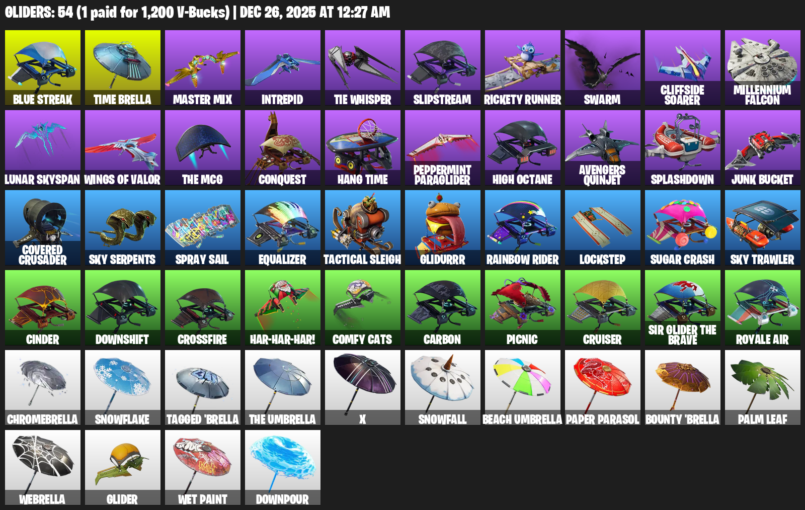 Time Brella, Master Mix, Intrepid, TIE Whisper, Slipstream, Rickety Runner, Swarm, Cliffside Soarer, Millennium Falcon, Lunar Skyspan, Conquest, Peppermint Paraglider, High Octane, Avengers Quinjet, Splashdown, Junk Bucket