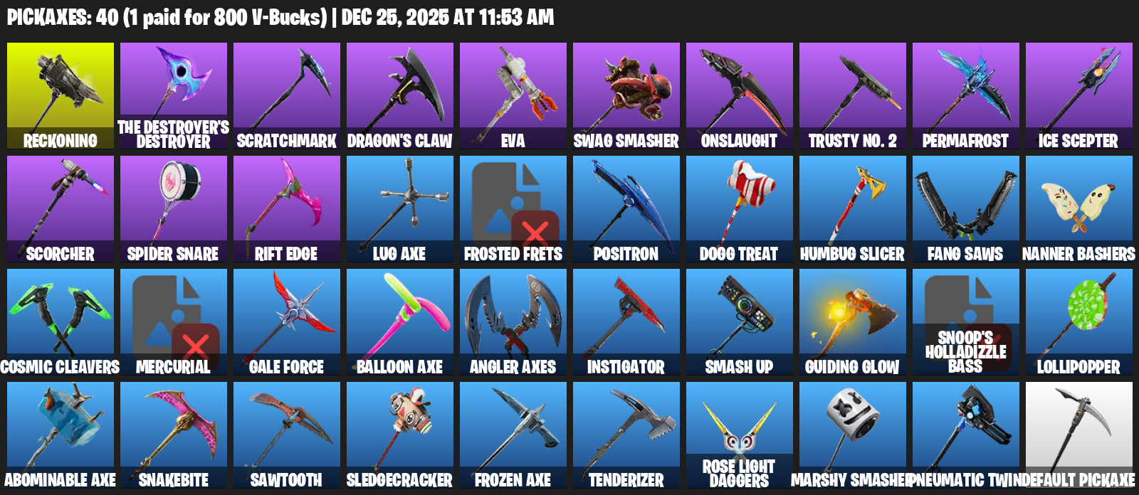 Reckoning, Scratchmark, Dragon’s Claw, EVA, Swag Smasher, Onslaught, Trusty No. 2, Permafrost, Ice Scepter, Scorcher, Spider Snare, Rift Edge, Lug Axe, Frosted Frets, Positron, Dogg Treat, Humbug Slicer, Fang Saws, Nanner Bashers