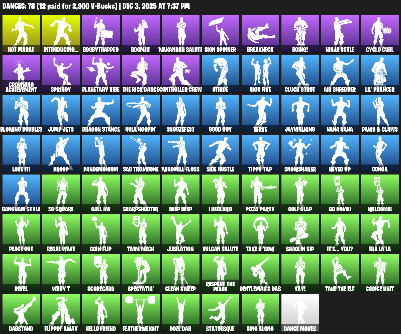Hot Marat, Introducing…, Boobytrapped, Boomin’, Wakandan Salute, Sign Spinner, Breakneck, Boing!, Ninja Style, Cyclo Curl, Crowning Achievement, Springy, Planetary Vibe, Controller Crew, Stride, High Five, Cluck Strut, Air Shredder, Lil’ Prancer