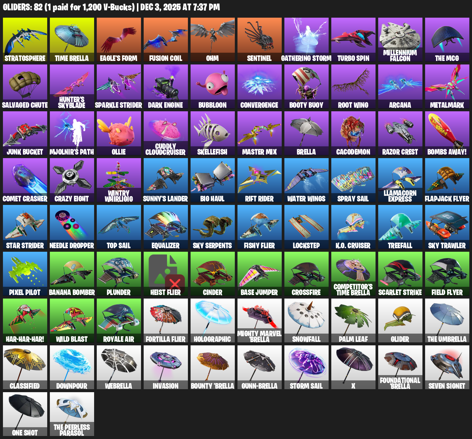 Stratosphere, Time Brella, Eagle’s Form, Ohm, Turbo Spin, Millennium Falcon, Salvaged Chute, Hunter’s Skyblade, Sparkle Strider, Dark Engine, Bubbloon, Convergence, Booty Buoy, Root Wing, Arcana, Metalmark