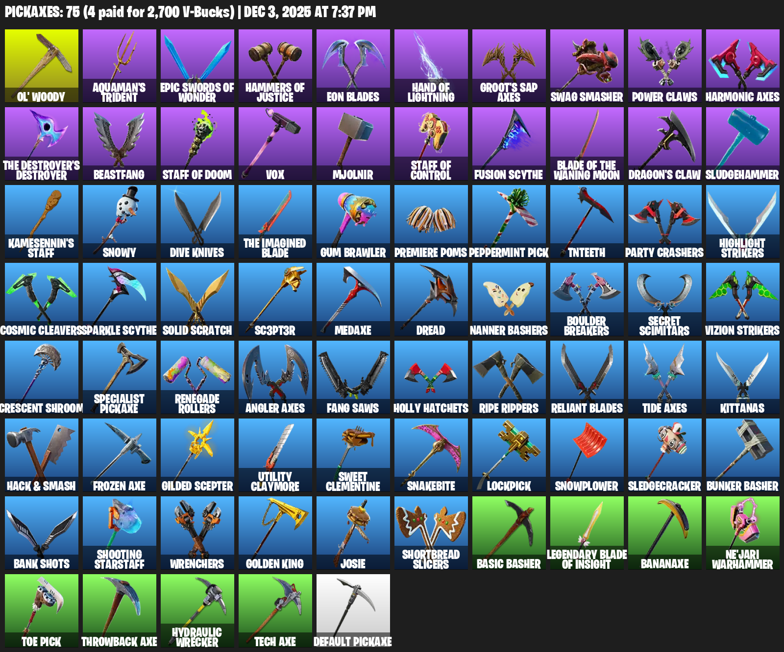 Ol’ Woody, Aquaman’s Trident, Hammers of Justice, Eon Blades, Groot’s Sap Axes, Swag Smasher, Power Claws, Beastfang, Vox, Mjolnir, Dragon’s Claw, Sludgehammer