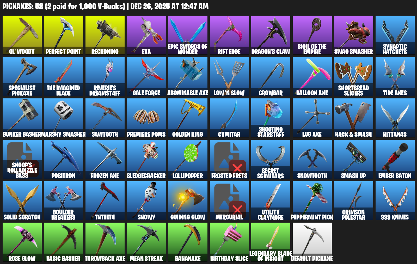 Ol’ Woody, Reckoning, EVA, Rift Edge, Dragon’s Claw, Sigil of the Empire, Swag Smasher, Synaptic Hatchets, Reverie’s Dreamstaff, Gale Force, Abominable Axe, Low ‘n Slow, Crowbar, Shortbread Slicers, Tide Axes