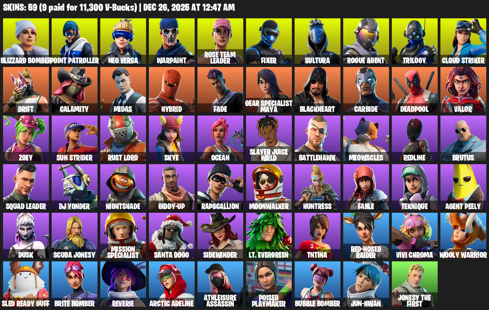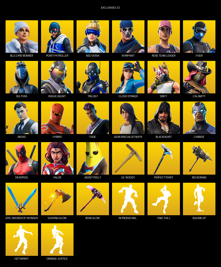Point Patroller, Gear Specialist Maya, Blizzard Bomber, Neo Versa, Warpaint, Rose Team Leader, Fixer, Sultura, Rogue Agent, Trilogy, Cloud Striker, Drift, Calamity, Midas, Hybrid, Fade, Blackheart, Carbide, Deadpool, Valor