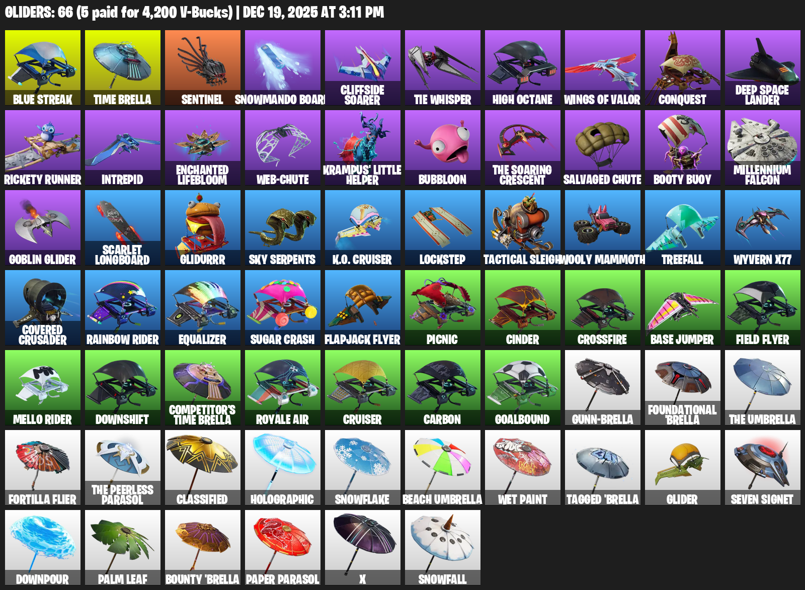 Time Brella, Sentinel, Snowmando Board, Cliffside Soarer, TIE Whisper, High Octane, Conquest, Deep Space Lander, Rickety Runner, Intrepid, Enchanted Lifebloom, Krampus’ Little Helper, Bubbloon, Salvaged Chute, Booty Buoy, Millennium Falcon
