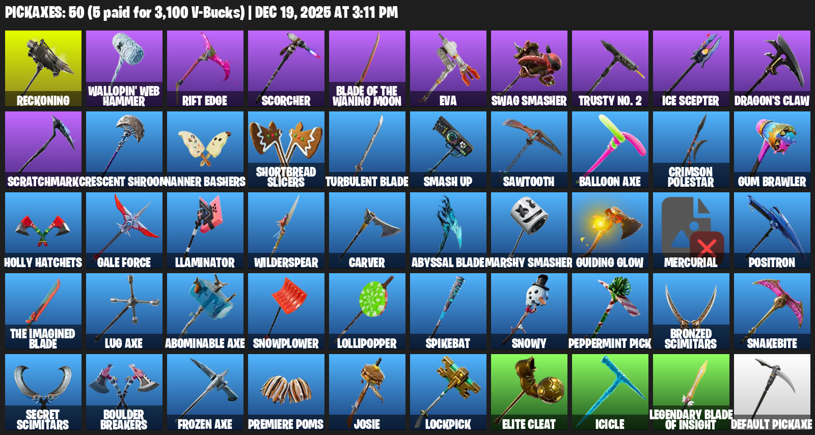 Reckoning, Wallopin’ Web Hammer, Rift Edge, Scorcher, EVA, Swag Smasher, Trusty No. 2, Ice Scepter, Dragon’s Claw, Scratchmark, Crescent Shroom, Nanner Bashers, Shortbread Slicers, Turbulent Blade, Smash Up, Sawtooth, Balloon Axe, Crimson Polestar, Gum Brawler