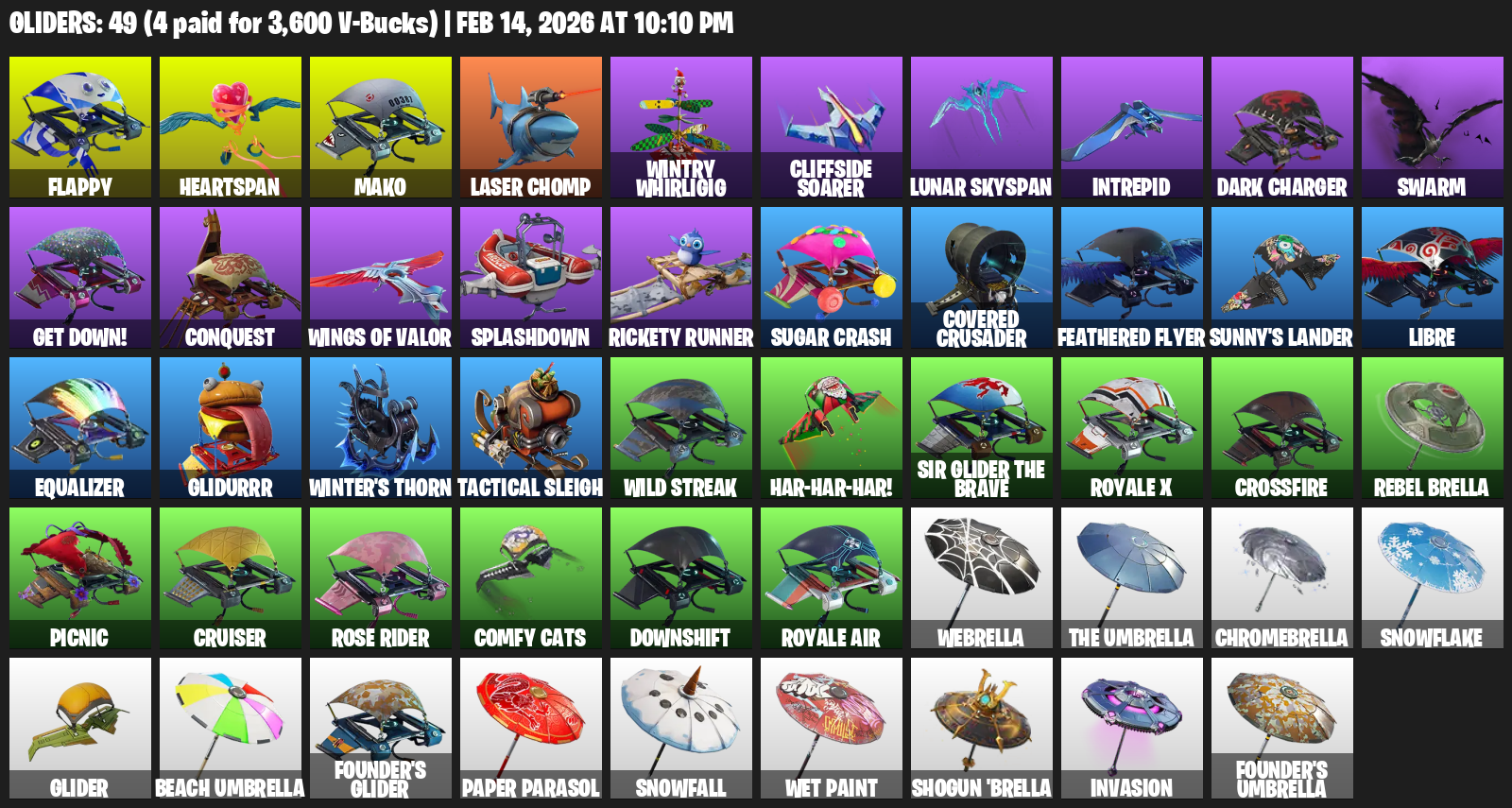 Mako, Flappy, Heartspan, Laser Chomp, Wintry Whirligig, Cliffside Soarer, Lunar Skyspan, Intrepid, Dark Charger, Swarm, Get Down!, Conquest, Splashdown, Rickety Runner, Sugar Crash, Covered Crusader, Feathered Flyer, Sunny’s Lander, Libre