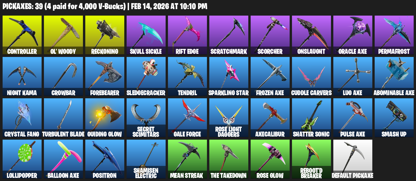 Controller, Ol’ Woody, Reckoning, Skull Sickle, Rift Edge, Scratchmark, Scorcher, Onslaught, Oracle Axe, Permafrost, Night Kama, Crowbar, Forebearer, Sledgecracker, Tendril, Sparkling Star, Cuddle Carvers