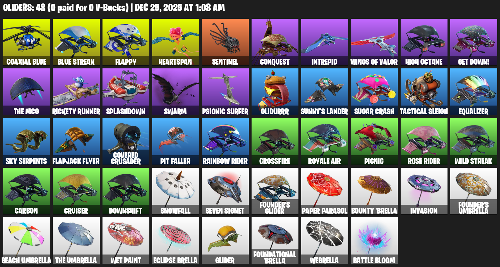 Flappy, Heartspan, Conquest, Intrepid, Wings of Valor, High Octane, Get Down!, Rickety Runner, Splashdown, Swarm, Psionic Surfer, Glidurrr, Sunny’s Lander, Sugar Crash, Tactical Sleigh, Equalizer