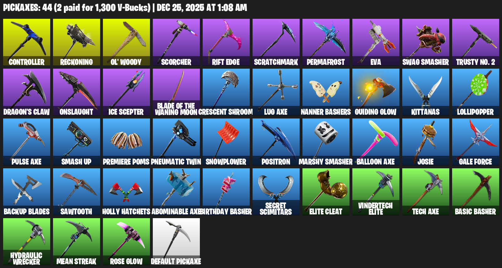 Controller, Reckoning, Ol’ Woody, Scorcher, Rift Edge, Scratchmark, Permafrost, EVA, Swag Smasher, Trusty No. 2, Dragon’s Claw, Onslaught, Ice Scepter, Crescent Shroom, Lug Axe, Nanner Bashers, Guiding Glow, Kittanas, Lollipopper