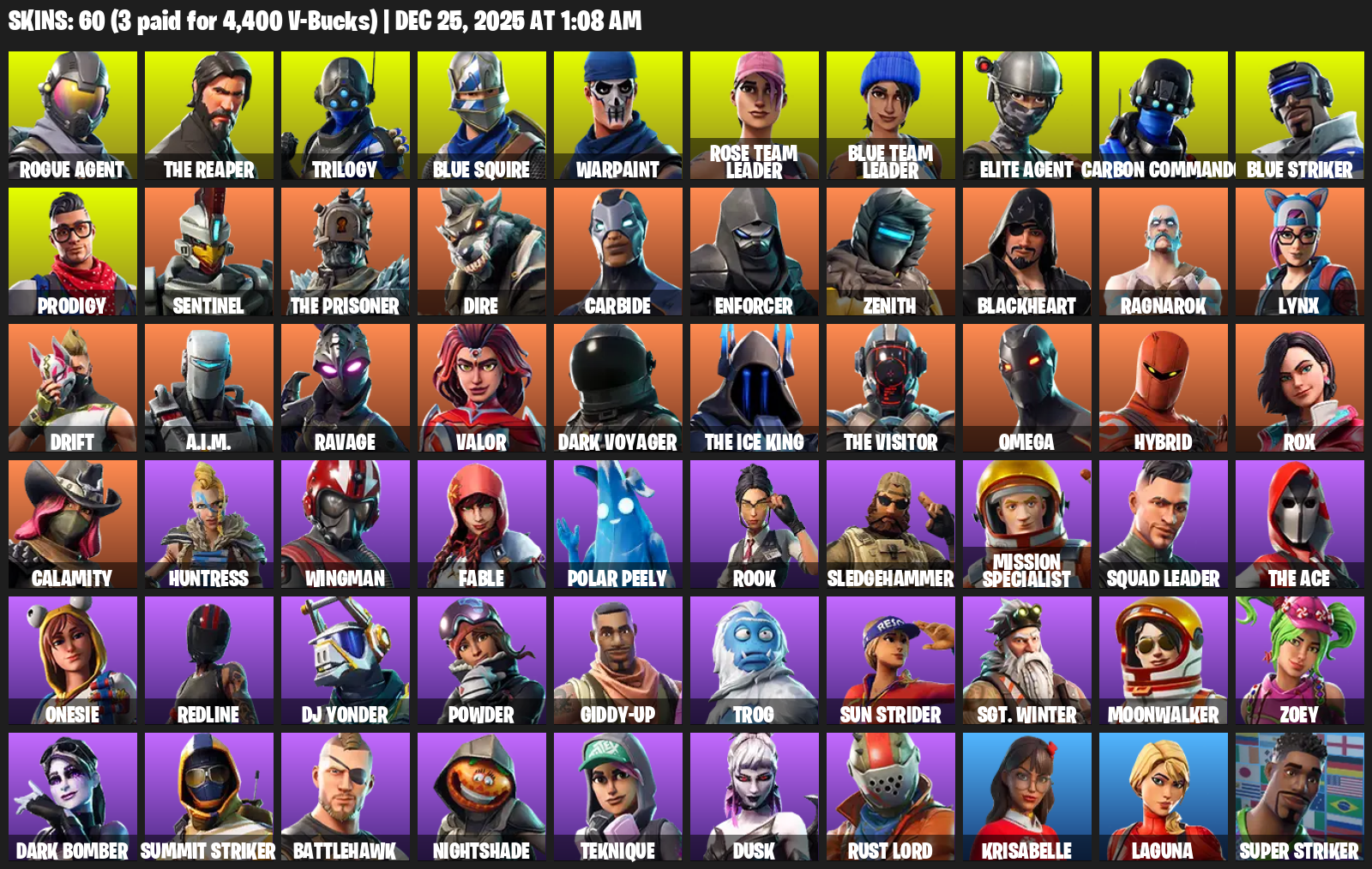 The Reaper, Blue Squire, Elite Agent, Omega, Trilogy, Warpaint, Rose Team Leader, Carbon Commando, Prodigy, Sentinel, Dire, Carbide, Enforcer, Zenith, Blackheart, Ragnarok