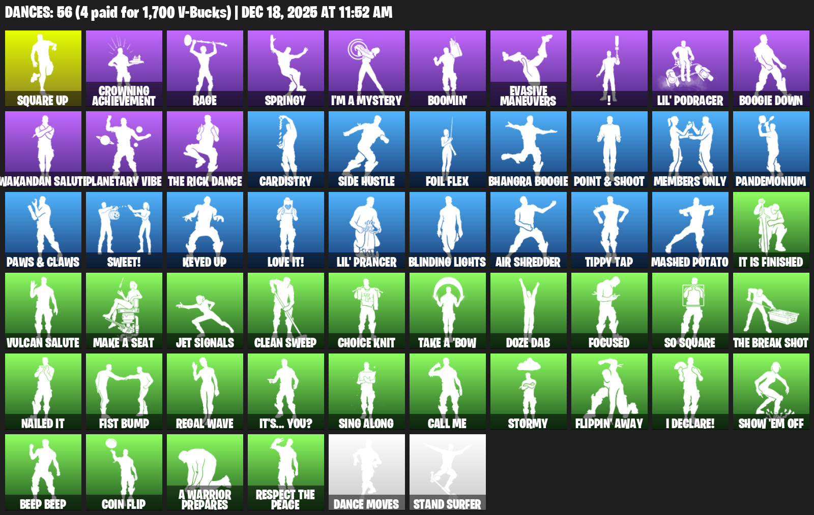 Square Up, Crowning Achievement, Rage, Springy, I’m a Mystery, Boomin’, Evasive Maneuvers, !, Lil’ Podracer, Boogie Down, Wakandan Salute, Planetary Vibe, The Rick Dance, Cardistry, Side Hustle, Foil Flex, Point & Shoot, Members Only, Pandemonium