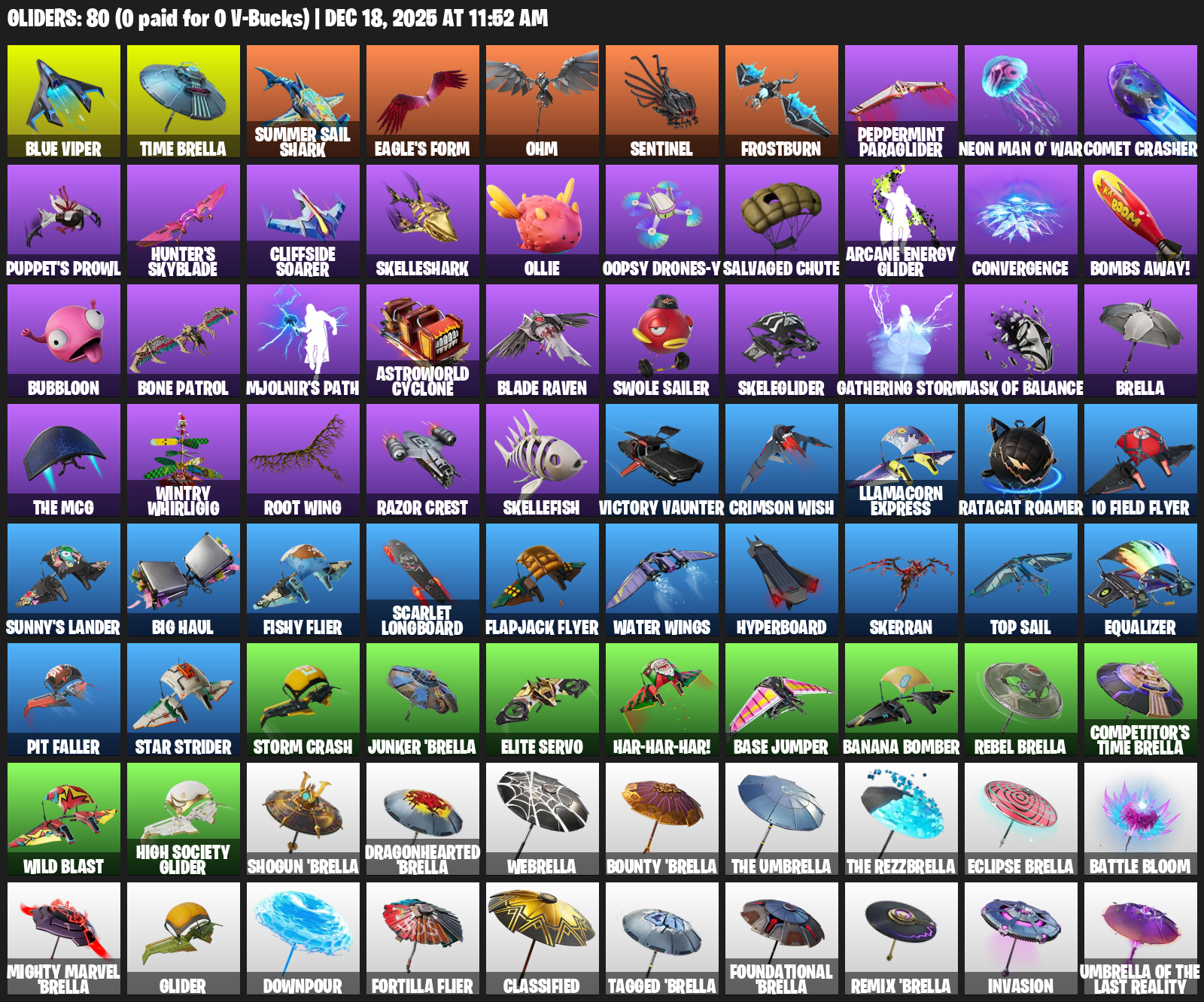 Blue Viper, Time Brella, Summer Sail Shark, Eagle’s Form, Ohm, Sentinel, Frostburn, Peppermint Paraglider, Neon Man O’ War, Comet Crasher, Puppet’s Prowl, Hunter’s Skyblade, Cliffside Soarer, Skelleshark, Ollie, Oopsy Drones-y, Salvaged Chute, Arcane Energy Glider, Convergence, Bombs Away!