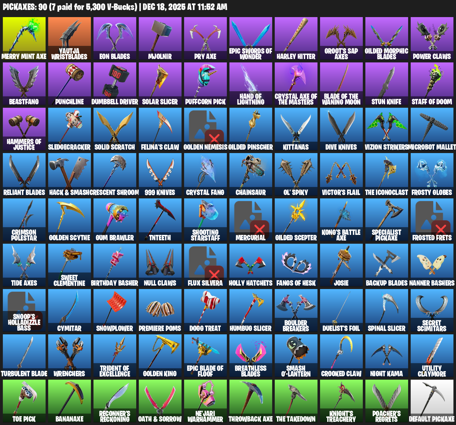 Merry Mint Axe, Yautja Wristblades, Eon Blades, Mjolnir, Harley Hitter, Groot’s Sap Axes, Power Claws, Beastfang, Punchline, Dumbbell Driver, Solar Slicer, Puffcorn Pick, Hand of Lightning, Stun Knife
