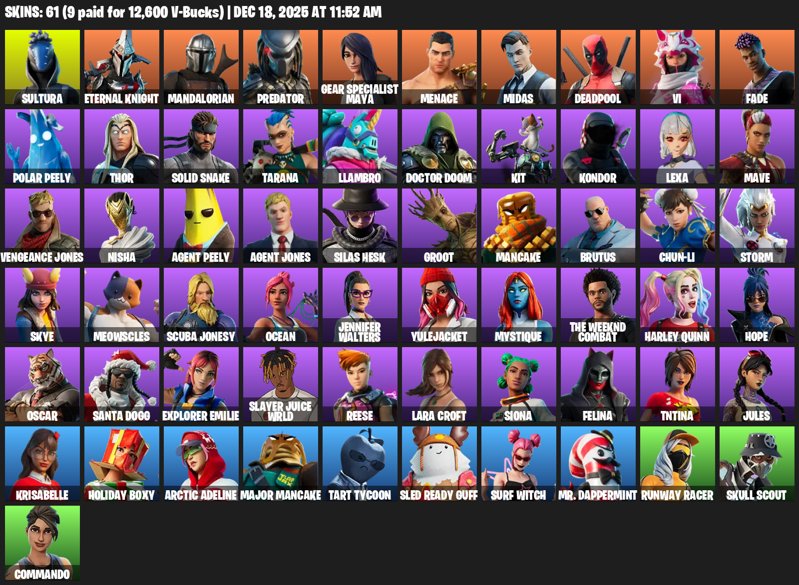 Gear Specialist Maya, Lara Croft, Sultura, Eternal Knight, Mandalorian, Predator, Menace, Midas, Deadpool, Vi, Fade, Polar Peely, Thor, Solid Snake, Tarana, Llambro, Doctor Doom, Kit, Kondor, Lexa