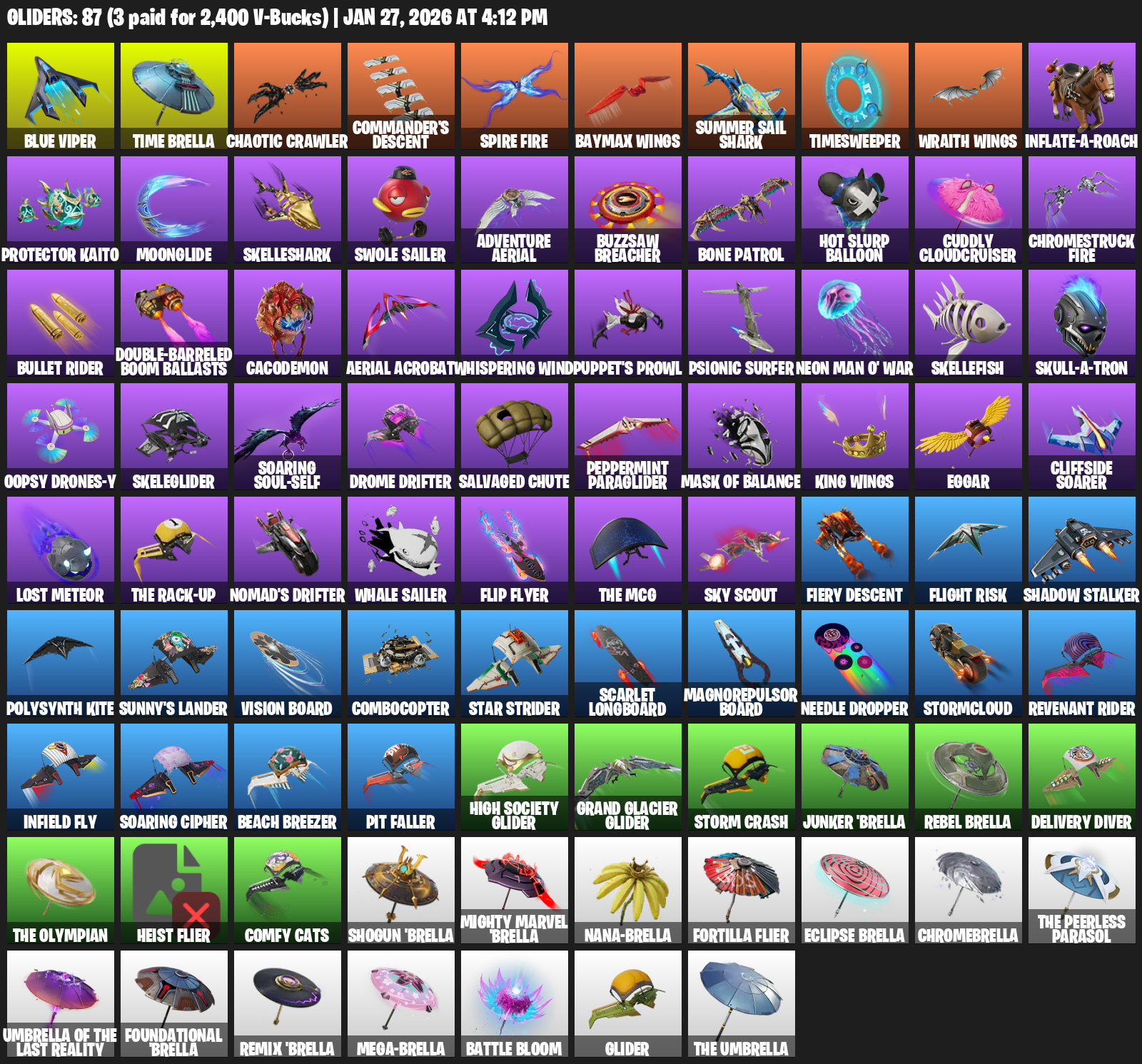 Blue Viper, Time Brella, Chaotic Crawler, Commander’s Descent, Baymax Wings, Summer Sail Shark, Timesweeper, Inflate-A-Roach, Protector Kaito, Moonglide, Skelleshark, Swole Sailer, Adventure Aerial, Buzzsaw Breacher, Bone Patrol, Hot Slurp Balloon, Cuddly Cloudcruiser, Chromestruck Fire