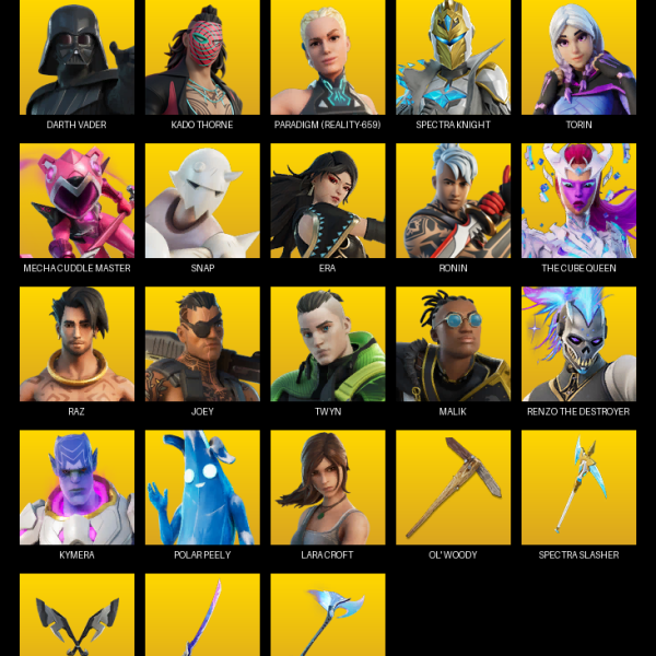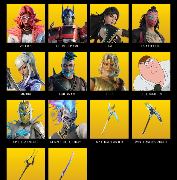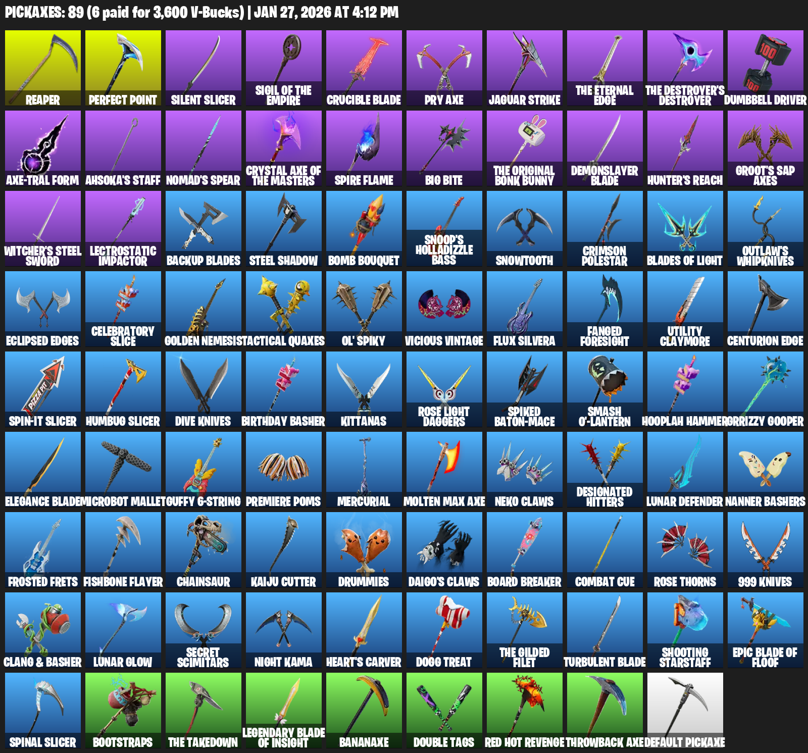 Reaper, Perfect Point, Silent Slicer, Crucible Blade, Pry Axe, Jaguar Strike, Dumbbell Driver, Ahsoka’s Staff, Nomad’s Spear, Big Bite, Hunter’s Reach, Groot’s Sap Axes