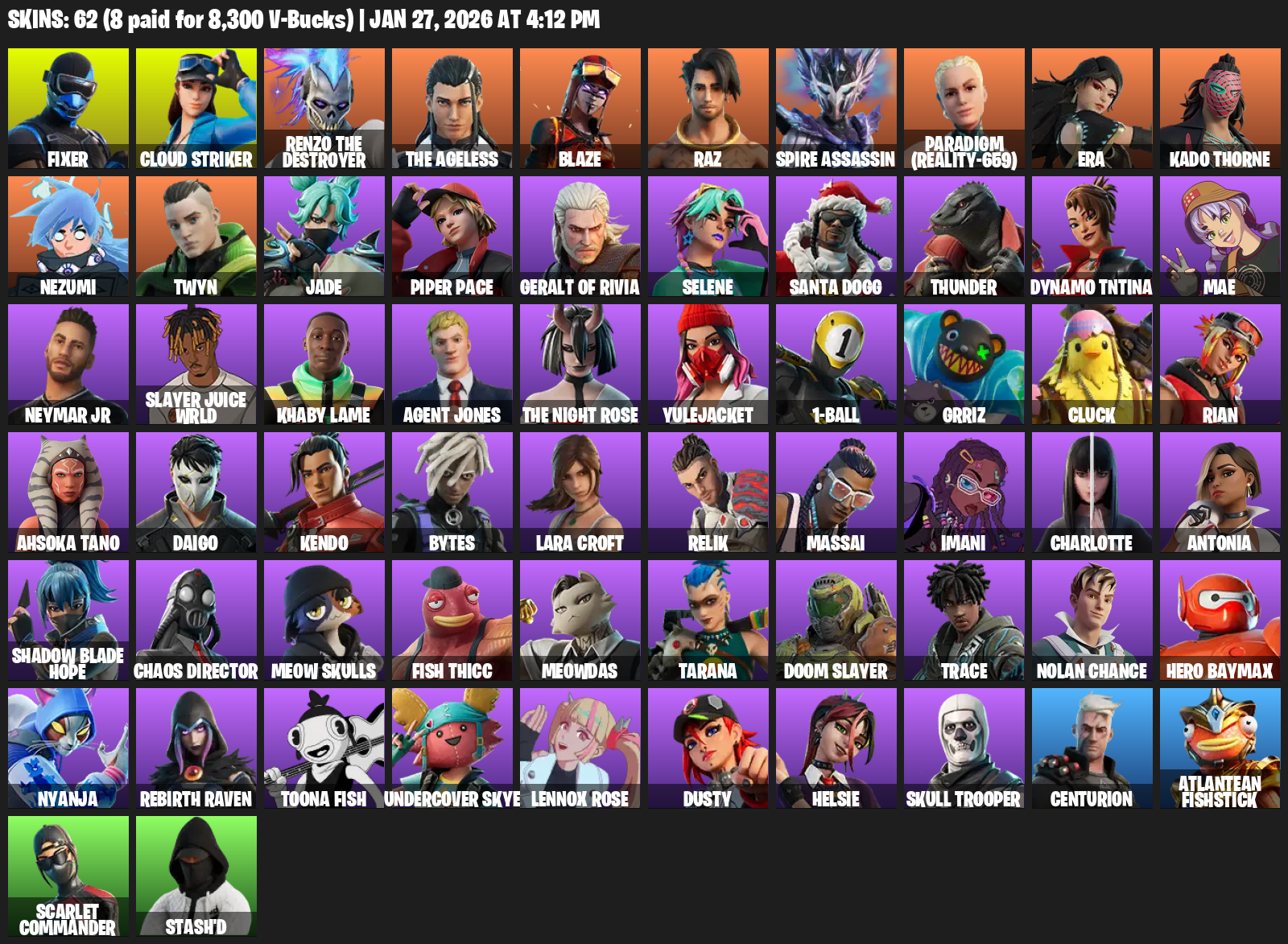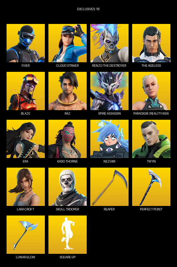 Lara Croft, Fixer, Cloud Striker, Renzo the Destroyer, Blaze, Raz, Spire Assassin, Paradigm (Reality-659), Era, Kado Thorne, Nezumi, Twyn, Jade, Piper Pace, Geralt of Rivia, Selene, Santa Dogg, Thunder, Dynamo TNTina