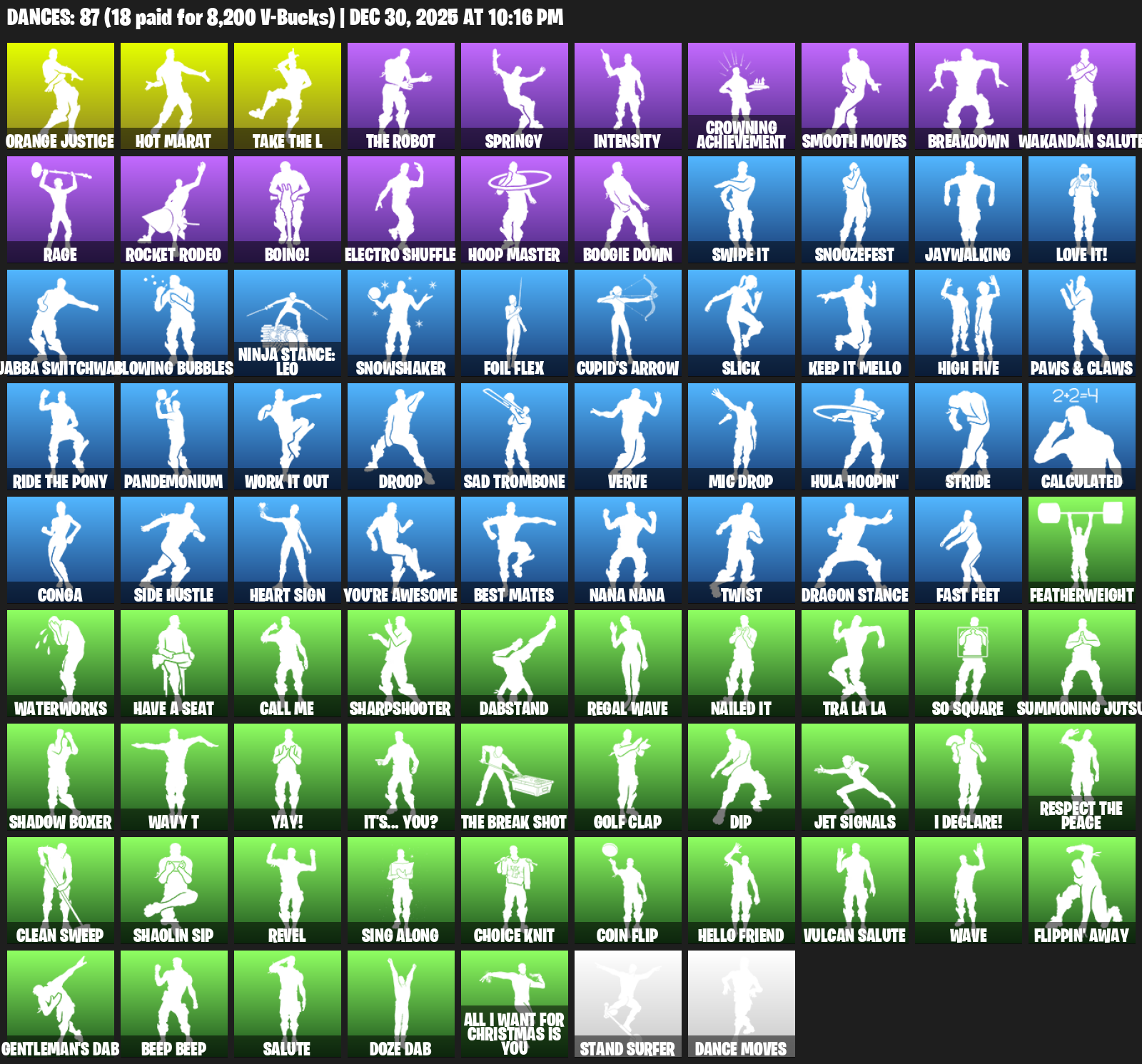 Hot Marat, Orange Justice, Springy, Intensity, Crowning Achievement, Smooth Moves, Breakdown, Wakandan Salute, Rage, Rocket Rodeo, Boing!, Electro Shuffle, Hoop Master, Boogie Down, Swipe It, Snoozefest, Jaywalking, Love it!