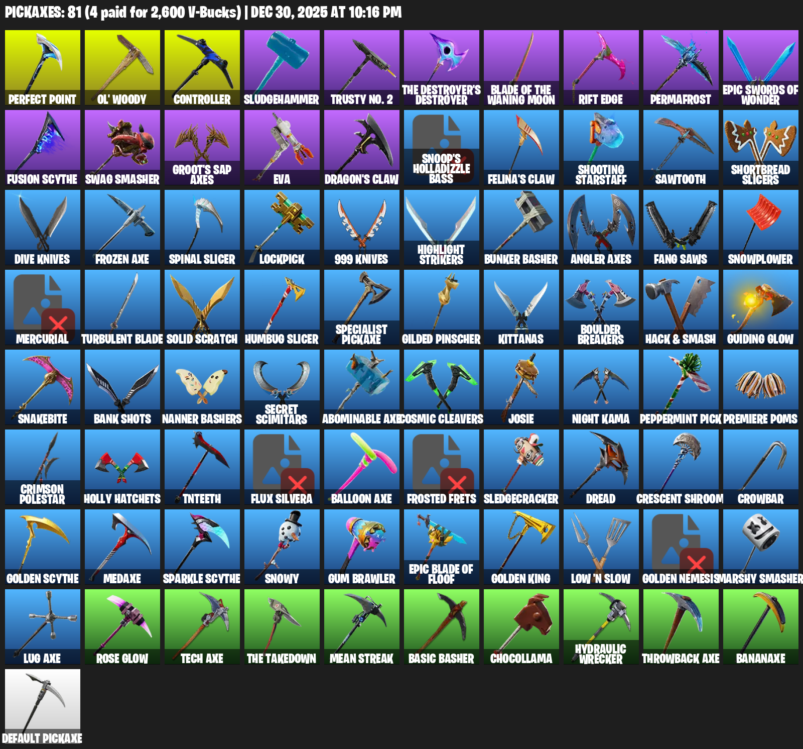 Perfect Point, Ol’ Woody, Controller, Sludgehammer, Trusty No. 2, Rift Edge, Permafrost, Swag Smasher, Groot’s Sap Axes, EVA, Dragon’s Claw, Snoop’s Holladizzle Bass, Shooting Starstaff, Sawtooth, Shortbread Slicers