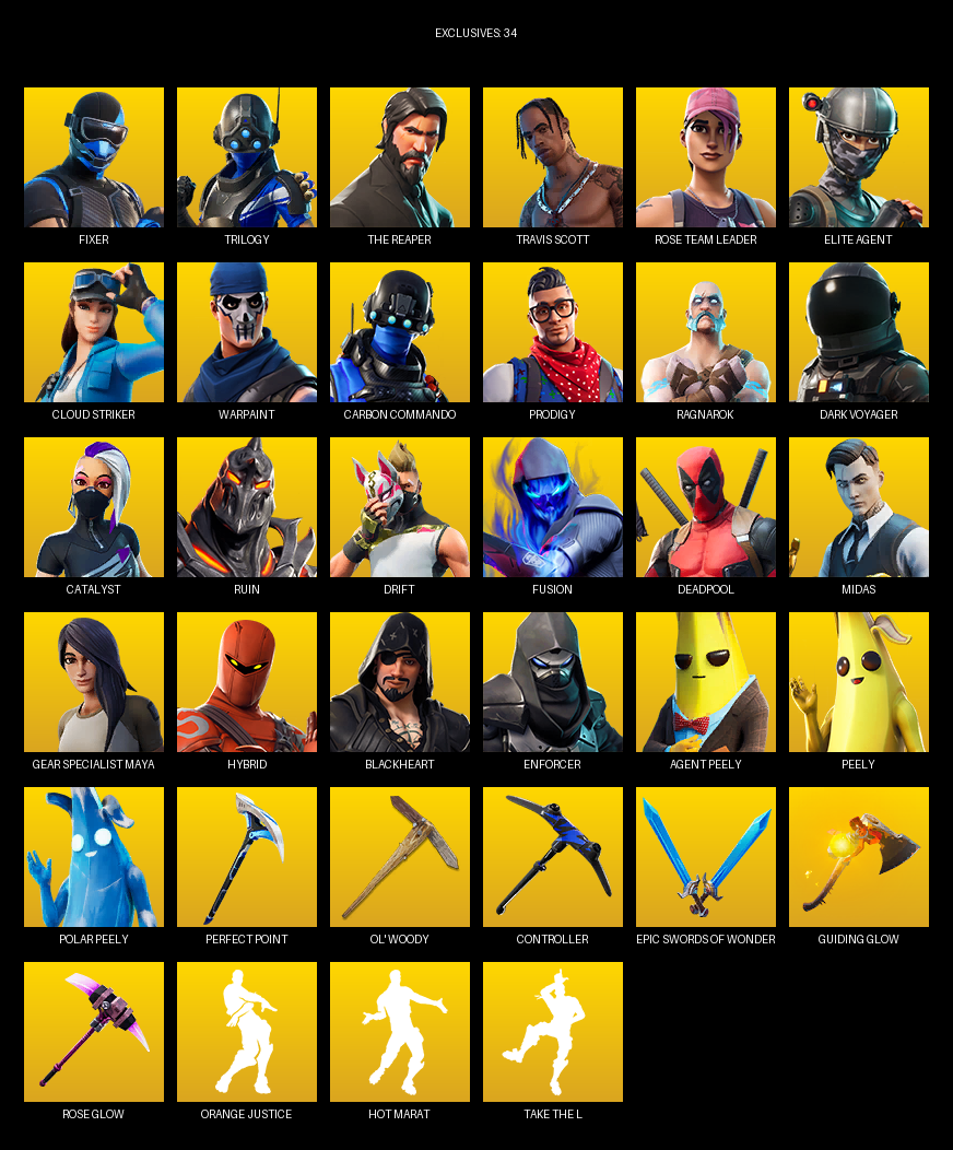The Reaper, Travis Scott, Elite Agent, Gear Specialist Maya, Fixer, Trilogy, Rose Team Leader, Cloud Striker, Warpaint, Carbon Commando, Prodigy, Ragnarok, Dark Voyager, Catalyst, Ruin, Drift, Fusion, Deadpool, Midas, Hybrid
