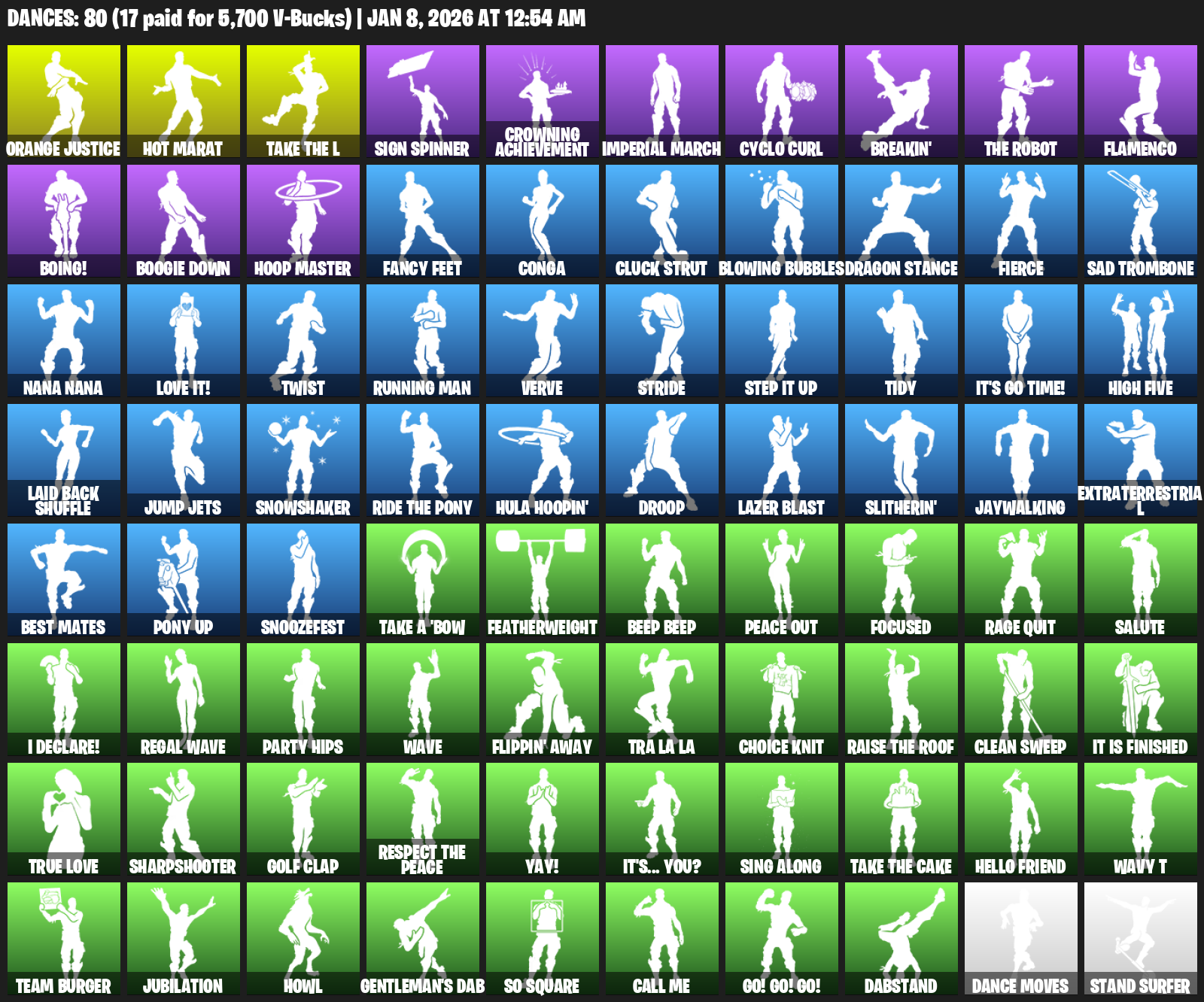 Hot Marat, Orange Justice, Sign Spinner, Crowning Achievement, Imperial March, Cyclo Curl, Breakin’, Flamenco, Boing!, Boogie Down, Hoop Master, Fancy Feet, Conga, Cluck Strut, Blowing Bubbles, Dragon Stance, Fierce, Sad Trombone