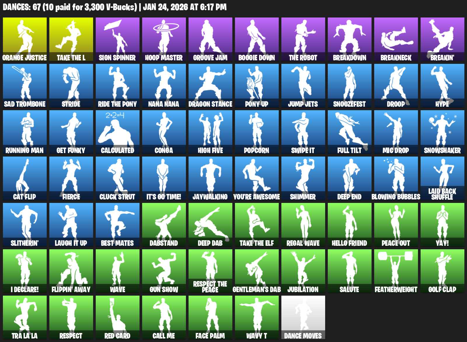 Orange Justice, Sign Spinner, Hoop Master, Groove Jam, Boogie Down, Breakdown, Breakneck, Breakin’, Sad Trombone, Stride, Nana Nana, Dragon Stance, Pony Up, Jump Jets, Snoozefest, Droop, Hype