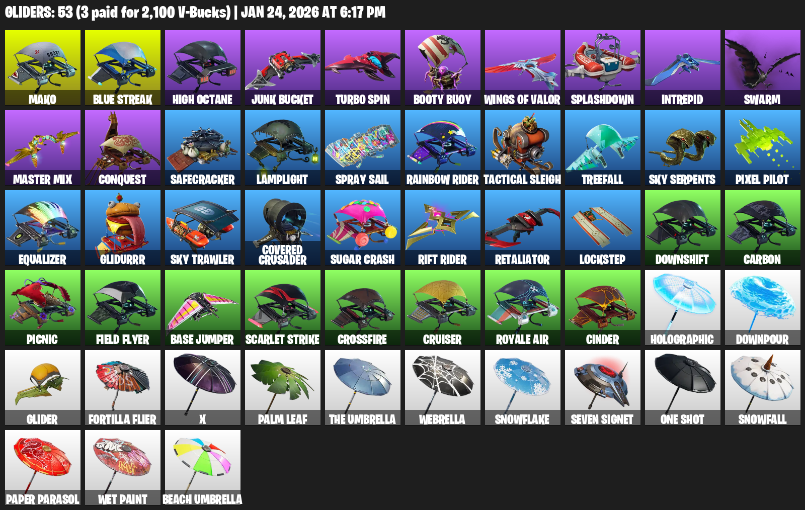Mako, High Octane, Junk Bucket, Turbo Spin, Booty Buoy, Splashdown, Intrepid, Swarm, Conquest, Safecracker, Lamplight, Spray Sail, Rainbow Rider, Tactical Sleigh, Treefall, Sky Serpents, Pixel Pilot