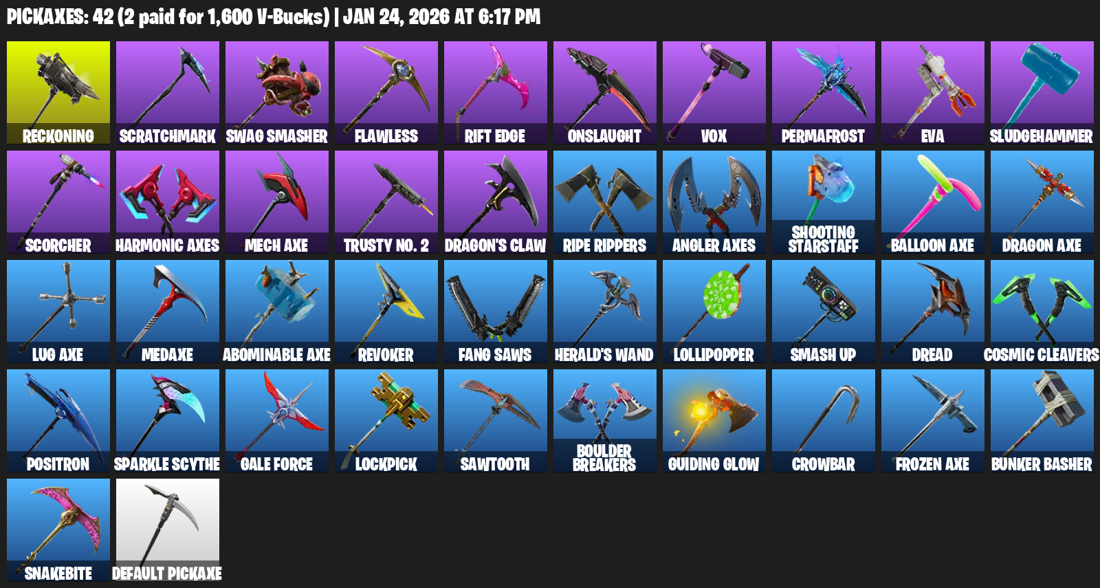 Reckoning, Scratchmark, Swag Smasher, Flawless, Rift Edge, Onslaught, Vox, Permafrost, EVA, Sludgehammer, Scorcher, Harmonic Axes, Mech Axe, Trusty No. 2, Dragon’s Claw, Ripe Rippers, Shooting Starstaff