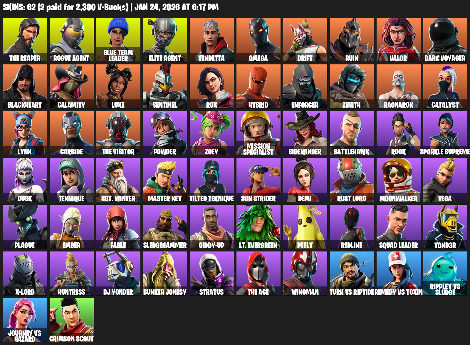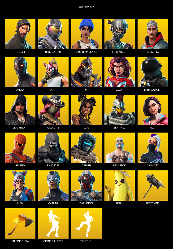 The Reaper, Elite Agent, Omega, Blue Team Leader, Vendetta, Drift, Ruin, Valor, Dark Voyager, Blackheart, Calamity, Luxe, Sentinel, Rox, Hybrid, Enforcer, Zenith, Ragnarok, Catalyst