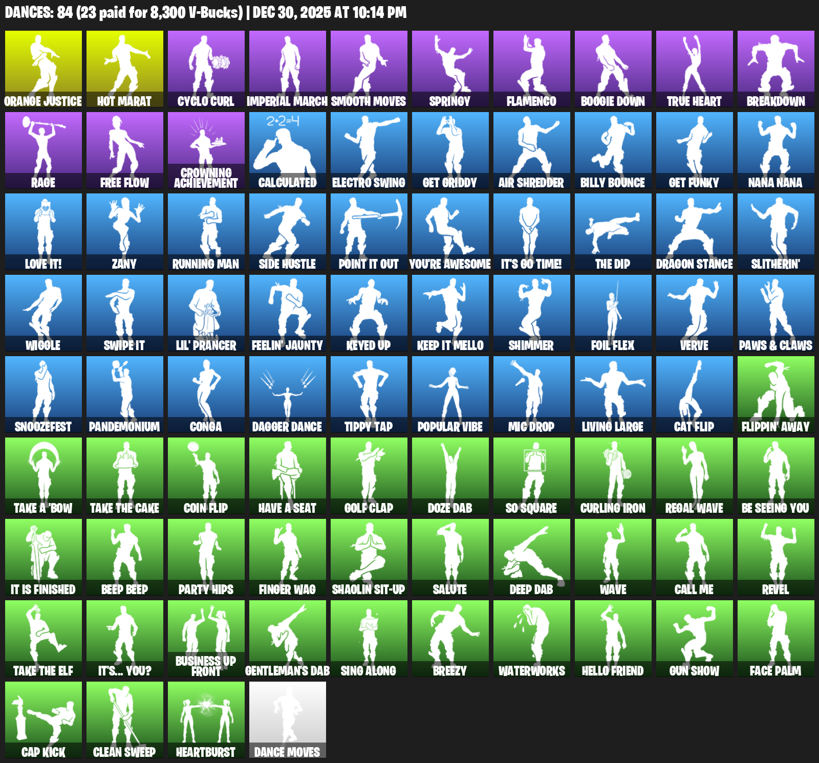Hot Marat, Orange Justice, Cyclo Curl, Imperial March, Smooth Moves, Springy, Flamenco, Boogie Down, True Heart, Breakdown, Rage, Free Flow, Crowning Achievement, Calculated, Electro Swing, Get Griddy, Air Shredder, Billy Bounce, Nana Nana