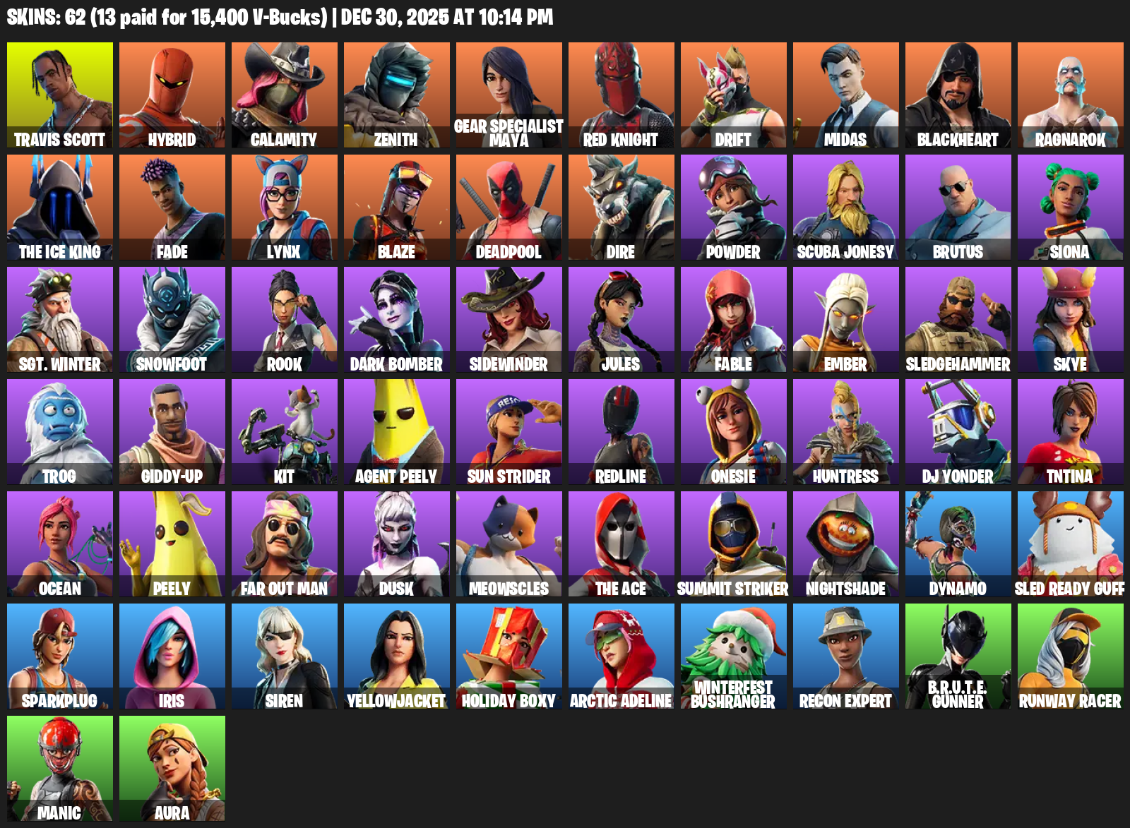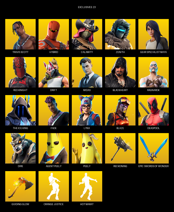 Travis Scott, Gear Specialist Maya, Hybrid, Calamity, Zenith, Red Knight, Drift, Midas, Blackheart, Ragnarok, The Ice King, Fade, Lynx, Blaze, Deadpool, Dire, Powder, Scuba Jonesy, Brutus, Siona