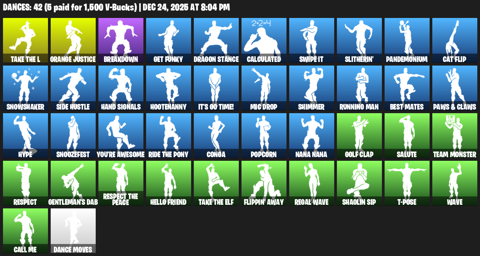 Take The L, Orange Justice, Breakdown, Get Funky, Dragon Stance, Calculated, Swipe It, Slitherin’, Pandemonium, Cat Flip, Snowshaker, Side Hustle, Hand Signals, Hootenanny, It’s Go Time!, Mic Drop, Shimmer, Running Man, Best Mates, Paws & Claws