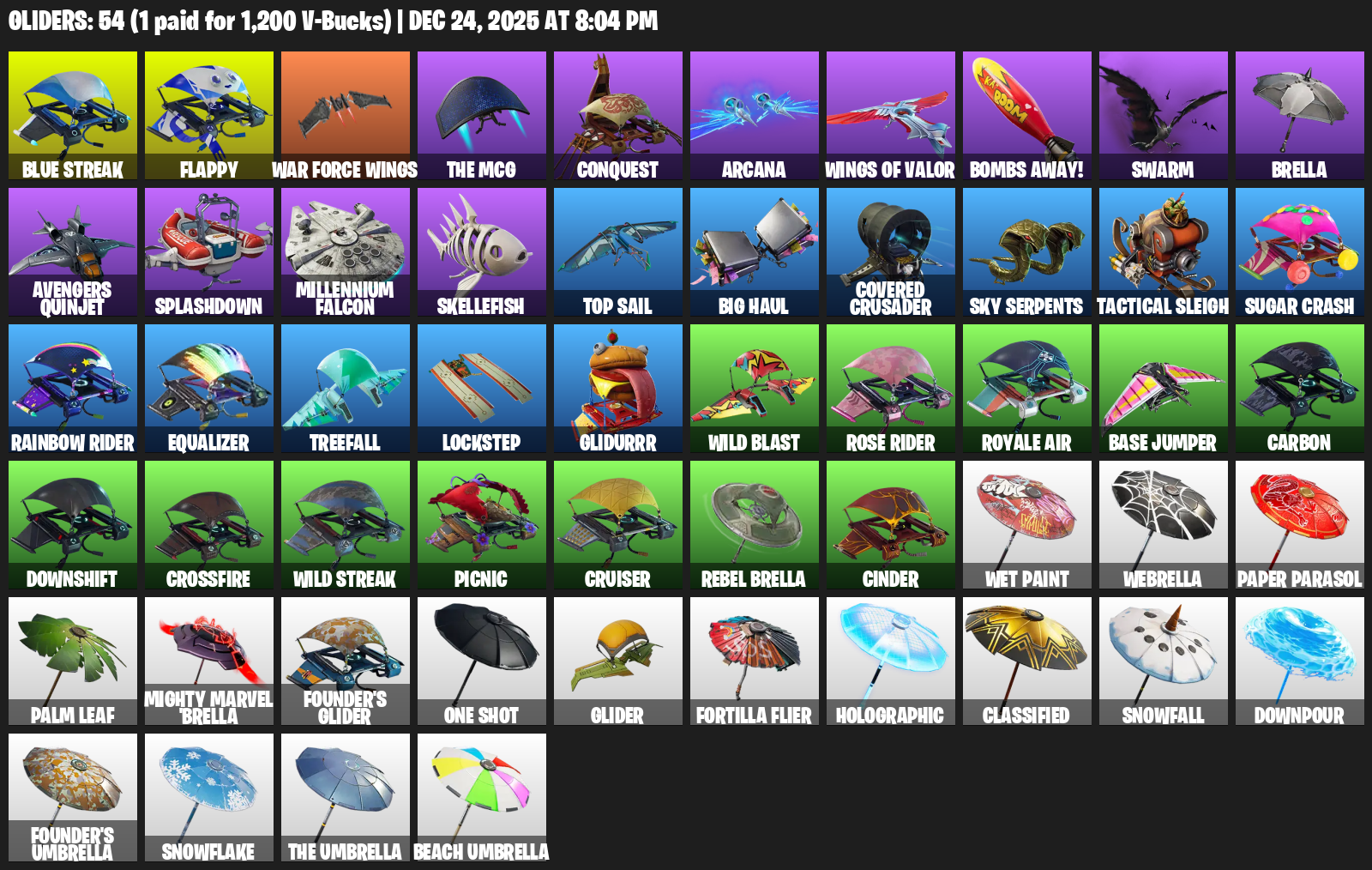 Flappy, Conquest, Arcana, Bombs Away!, Swarm, Brella, Avengers Quinjet, Splashdown, Millennium Falcon, Skellefish, Top Sail, Big Haul, Covered Crusader, Sky Serpents, Tactical Sleigh, Sugar Crash
