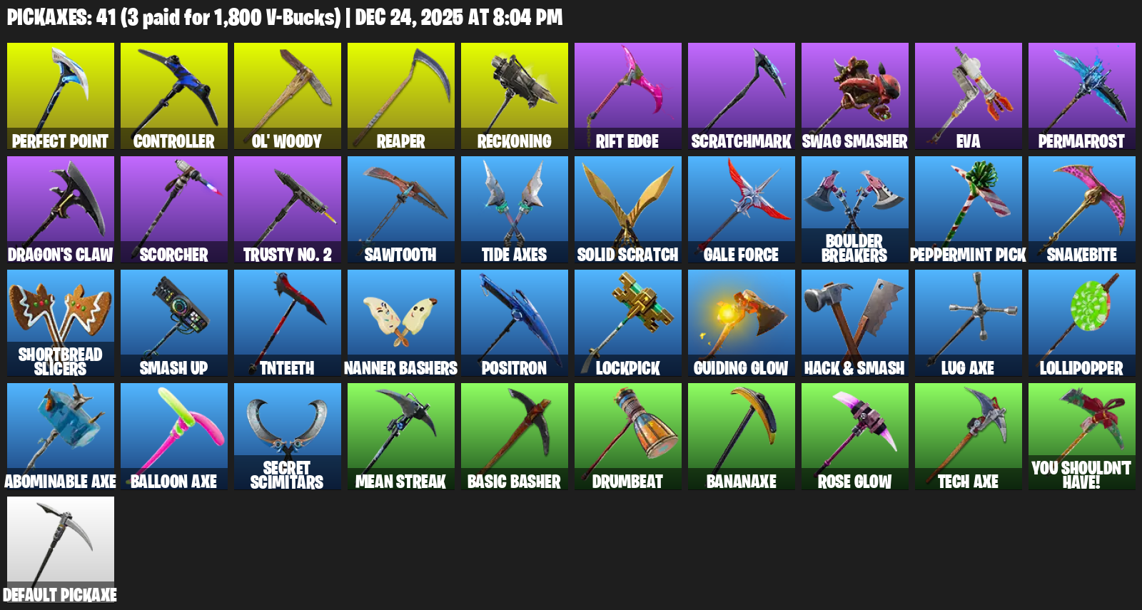 Controller, Ol’ Woody, Reaper, Reckoning, Rift Edge, Scratchmark, Swag Smasher, EVA, Permafrost, Dragon’s Claw, Scorcher, Trusty No. 2, Sawtooth, Tide Axes, Solid Scratch, Gale Force, Boulder Breakers, Peppermint Pick, Snakebite