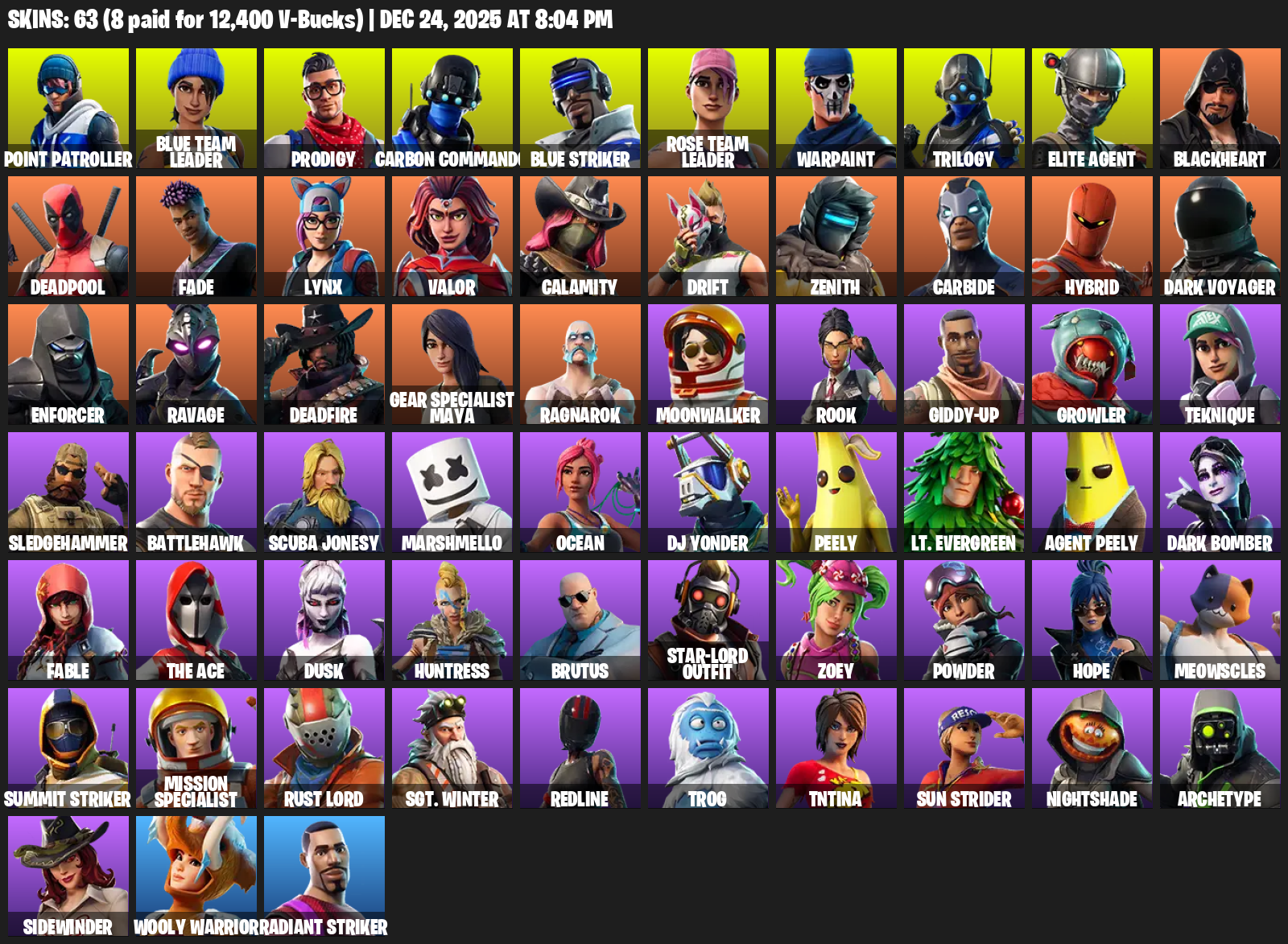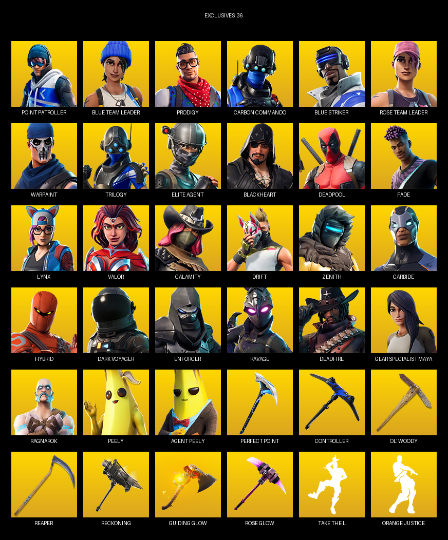 Point Patroller, Elite Agent, Gear Specialist Maya, Blue Team Leader, Prodigy, Carbon Commando, Warpaint, Trilogy, Blackheart, Deadpool, Fade, Lynx, Valor, Calamity, Drift, Zenith, Carbide, Hybrid