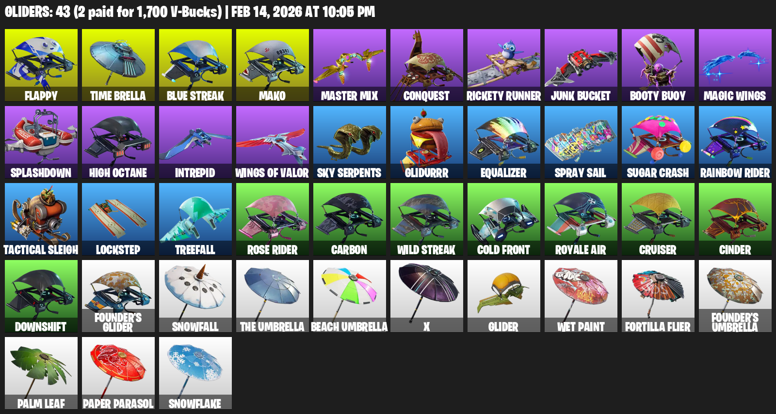 Mako, Flappy, Time Brella, Conquest, Rickety Runner, Junk Bucket, Booty Buoy, Magic Wings, Splashdown, High Octane, Intrepid, Sky Serpents, Glidurrr, Equalizer, Spray Sail, Sugar Crash, Rainbow Rider