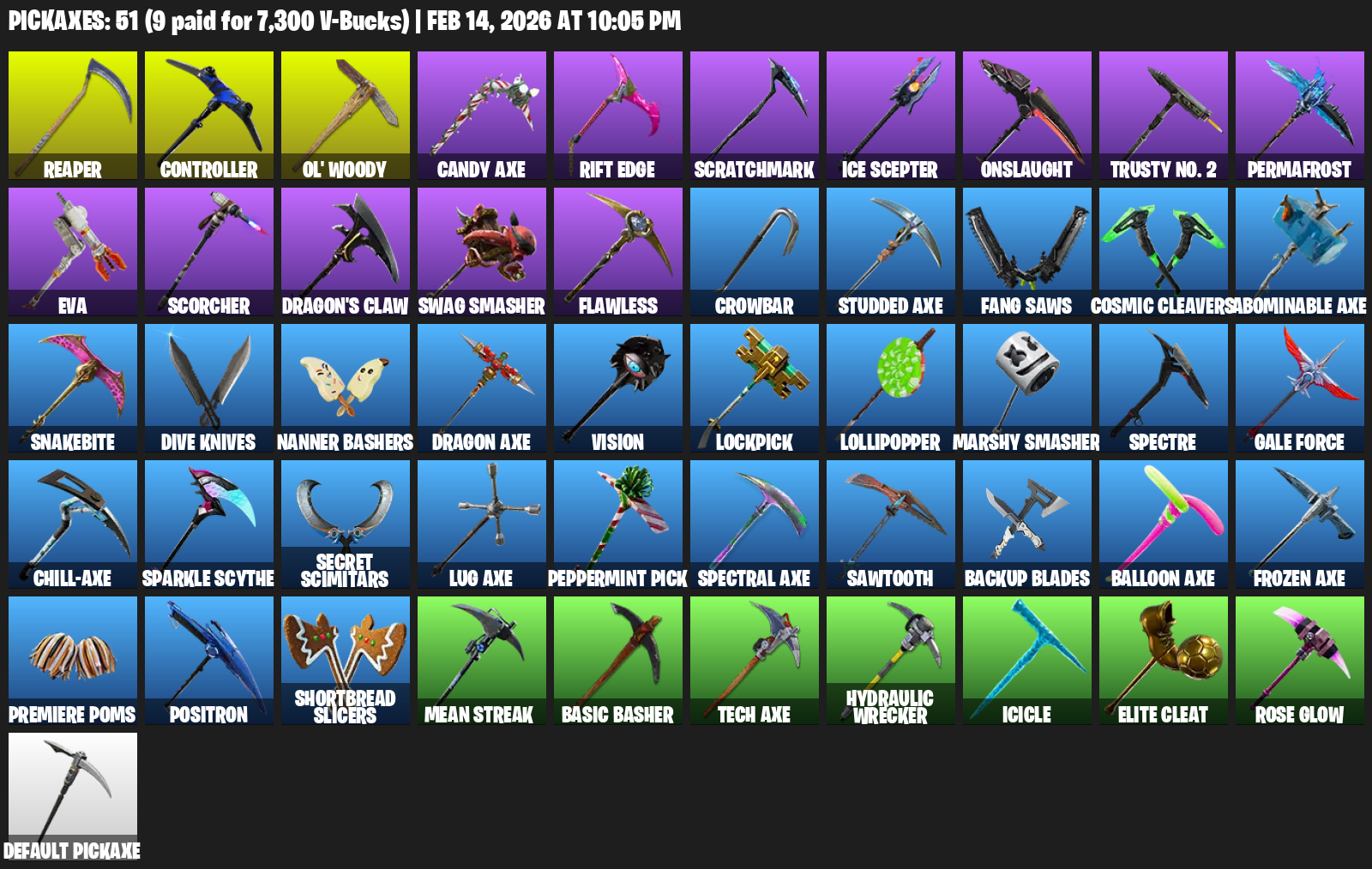 Controller, Ol’ Woody, Candy Axe, Rift Edge, Scratchmark, Ice Scepter, Onslaught, Trusty No. 2, Permafrost, EVA, Scorcher, Dragon’s Claw, Swag Smasher, Flawless, Crowbar, Fang Saws, Cosmic Cleavers