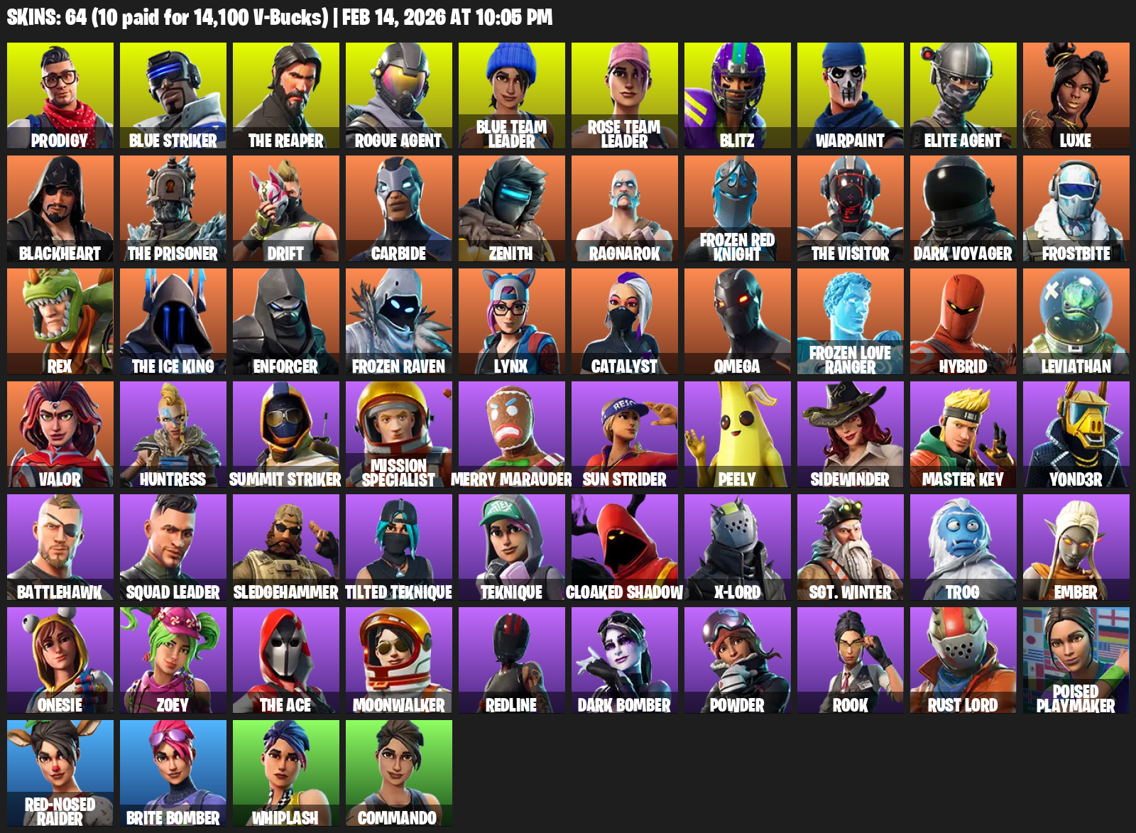 The Reaper, Elite Agent, Omega, Prodigy, Blue Striker, Rose Team Leader, Blitz, Warpaint, Luxe, Blackheart, Drift, Carbide, Zenith, Ragnarok, Frozen Red Knight, Dark Voyager