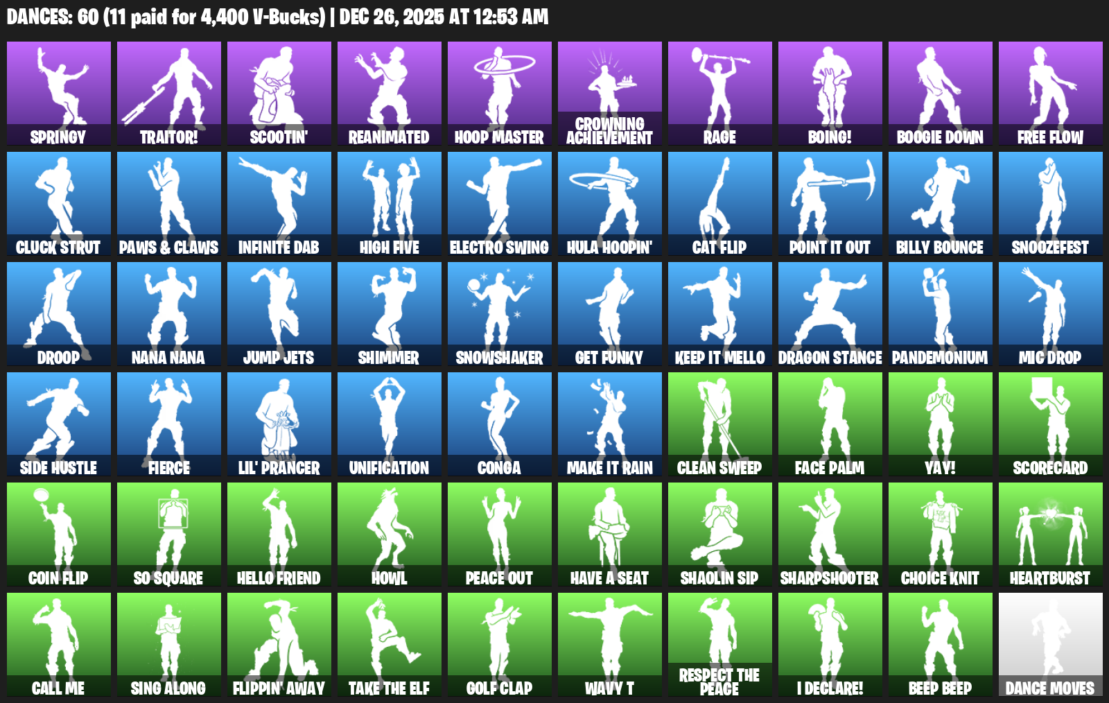 Springy, Traitor!, Scootin’, Reanimated, Hoop Master, Crowning Achievement, Rage, Boing!, Boogie Down, Free Flow, Cluck Strut, Paws & Claws, Infinite Dab, High Five, Electro Swing, Hula Hoopin’, Cat Flip, Point It Out, Billy Bounce, Snoozefest