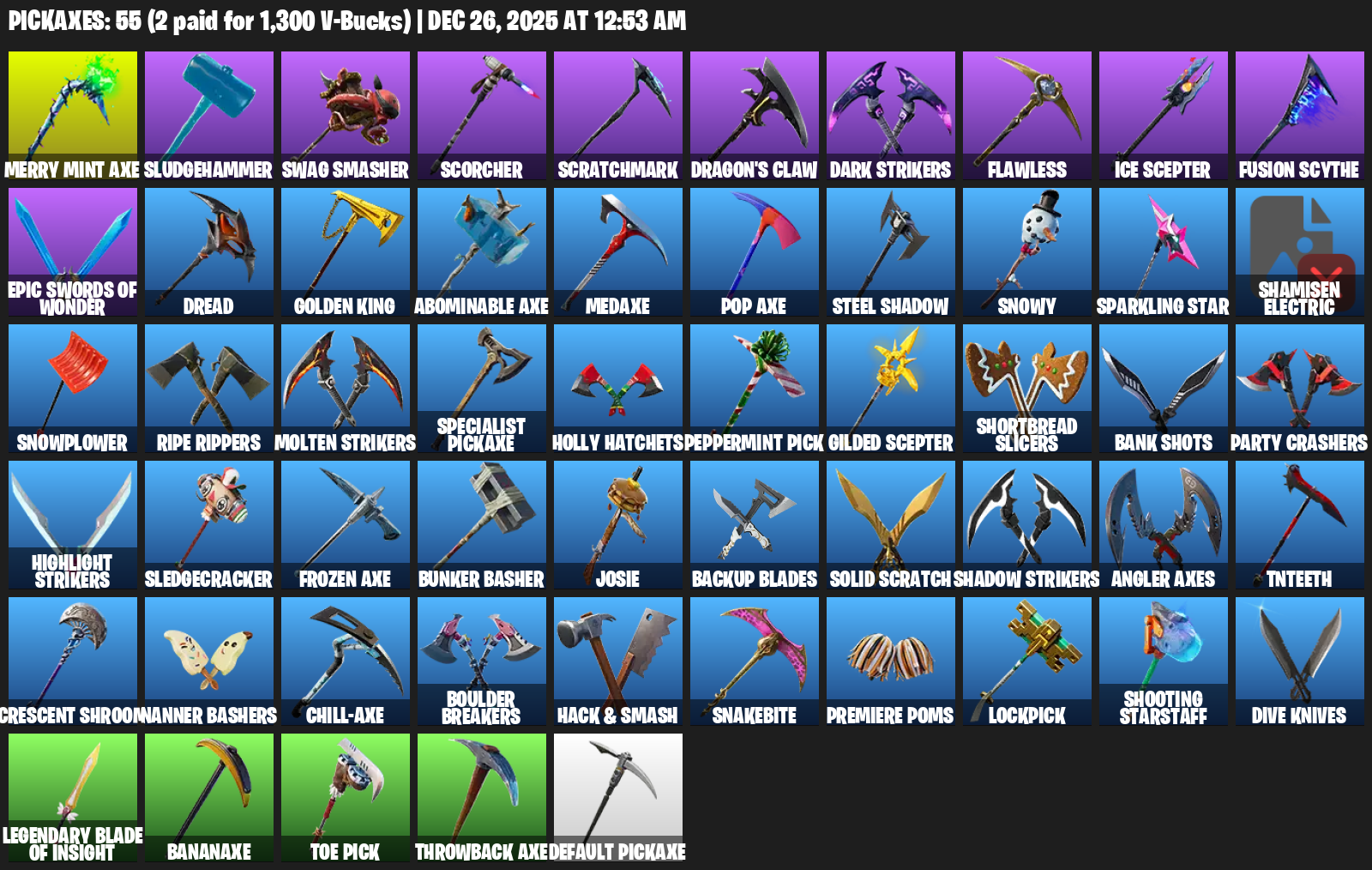 Merry Mint Axe, Sludgehammer, Swag Smasher, Scorcher, Scratchmark, Dragon’s Claw, Dark Strikers, Flawless, Dread, Medaxe, Steel Shadow, Snowy, Sparkling Star, Shamisen Electric