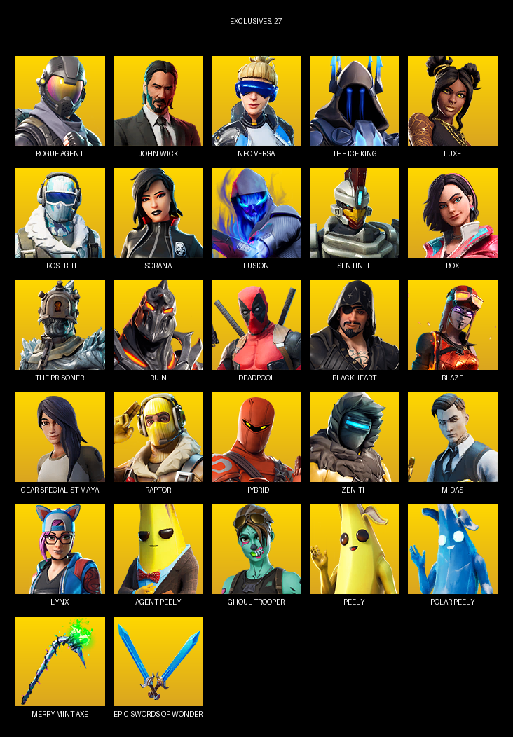 Gear Specialist Maya, Rogue Agent, John Wick, Neo Versa, The Ice King, Luxe, Frostbite, Sorana, Fusion, Sentinel, Rox, Ruin, Deadpool, Blackheart, Blaze, Raptor, Hybrid, Zenith, Midas