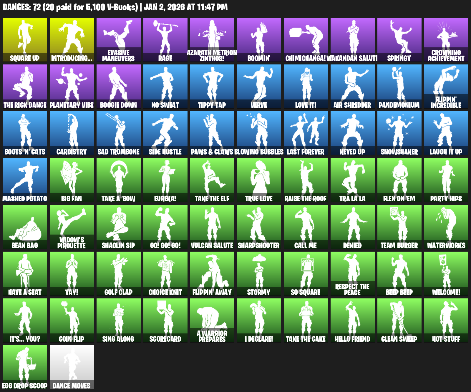 Introducing…, Square Up, Evasive Maneuvers, Rage, Azarath Metrion Zinthos!, Boomin’, Chimichanga!, Wakandan Salute, Springy, Crowning Achievement, Planetary Vibe, Boogie Down, No Sweat, Tippy Tap, Verve, Love it!, Air Shredder, Pandemonium, Flippin’ Incredible