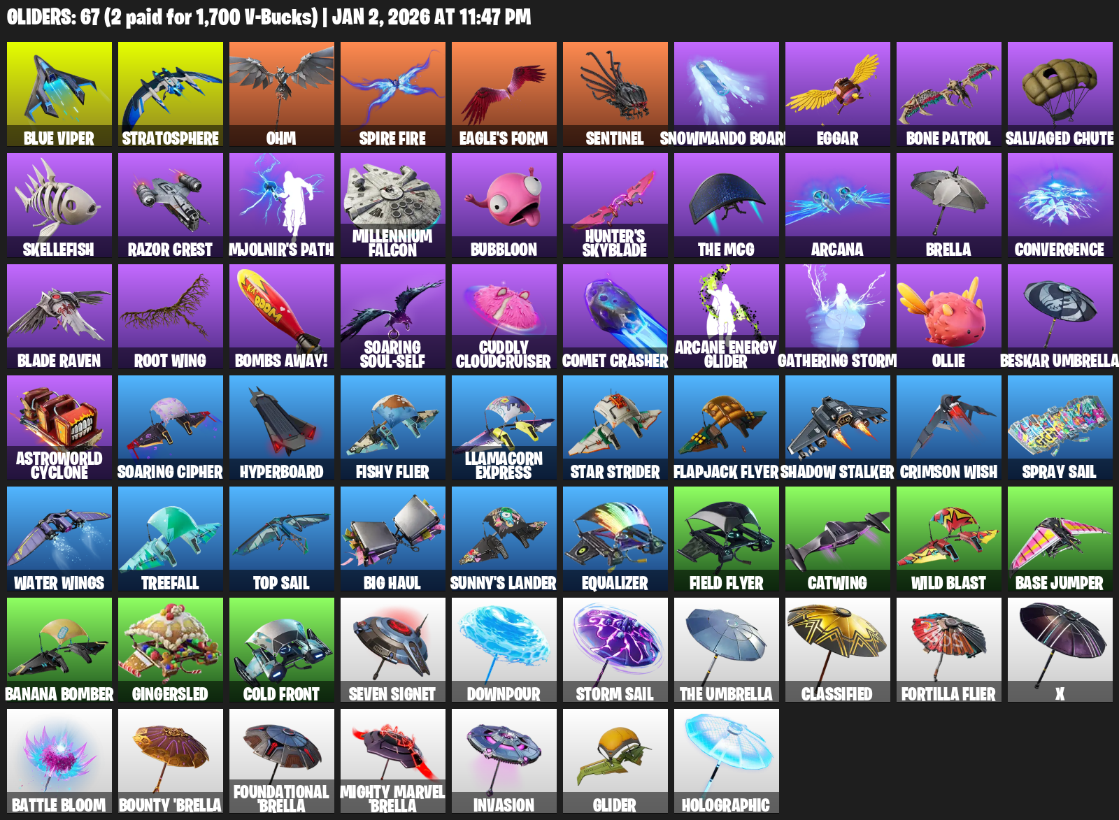 Blue Viper, Stratosphere, Ohm, Eagle’s Form, Sentinel, Snowmando Board, Eggar, Bone Patrol, Salvaged Chute, Skellefish, Razor Crest, Mjolnir’s Path, Millennium Falcon, Bubbloon, Hunter’s Skyblade, Arcana, Brella, Convergence