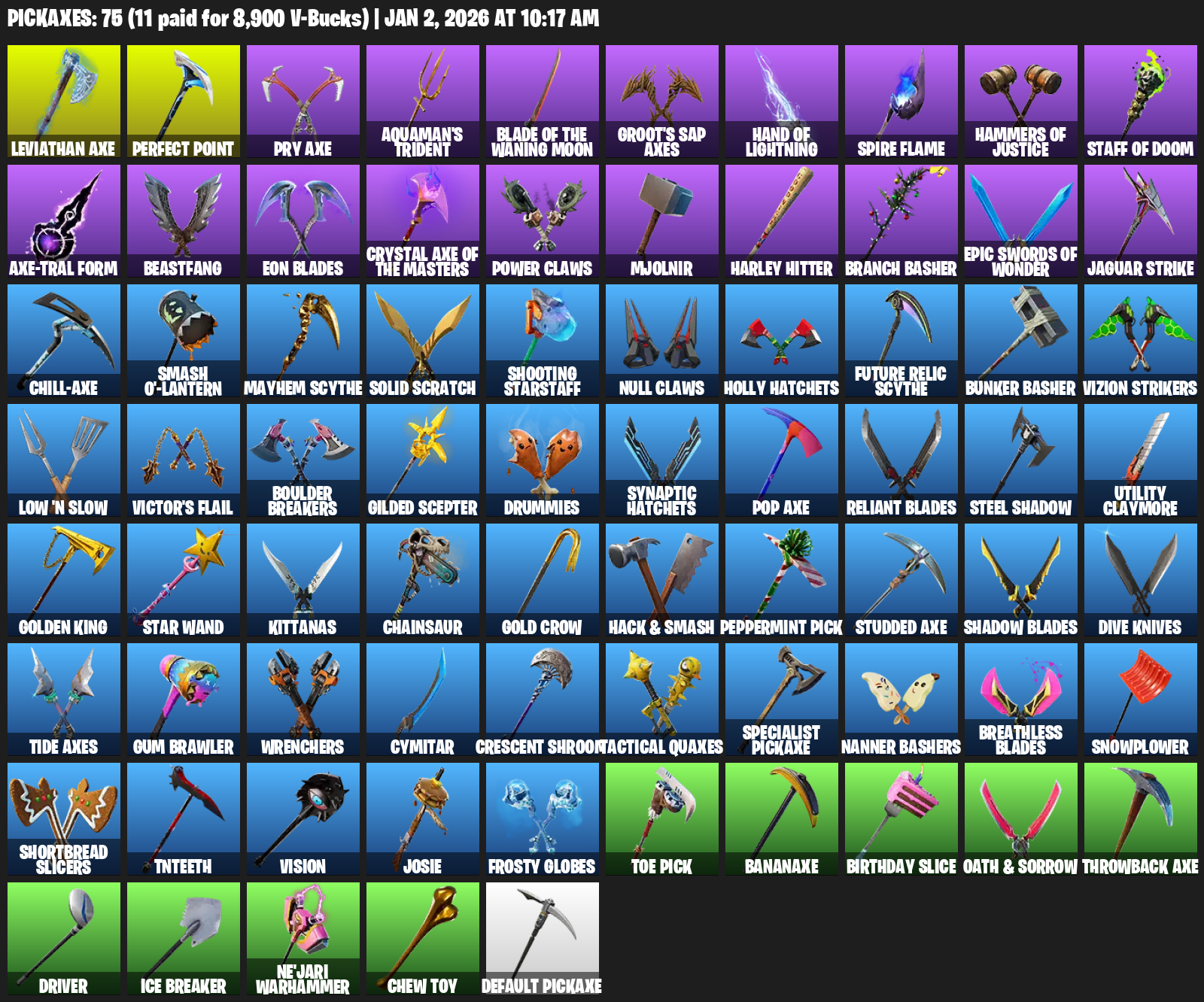 Leviathan Axe, Aquaman’s Trident, Groot’s Sap Axes, Hand of Lightning, Spire Flame, Beastfang, Eon Blades, Power Claws, Mjolnir, Harley Hitter, Branch Basher, Jaguar Strike